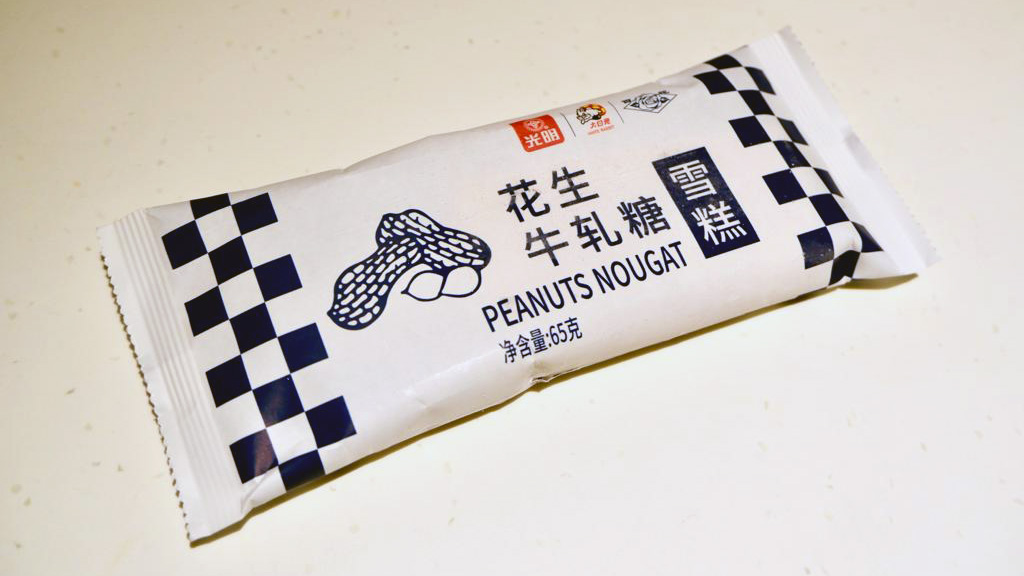 除了人氣的大白兔牛奶糖味,另有「大白兔花生牛軋糖雪條」。包裝則選用藍白色方格,感覺同樣復古懷舊。此款雪條採用長方形設計,於牛奶雪條中加入花生粒,小編認為雪條的黏牙度比「大白兔牛奶雪條」更勝一籌,加上花生後更能重現花生牛軋糖的口感,比起前者更有驚喜,喜歡牛軋糖的朋友不妨試試。