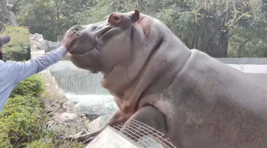 近日網上流傳一條影片,一個動物園內有頭巨大的河馬企圖跨過矮小的欄杆,進入人群,人群尖叫四散。這時候一名保安人員走近河馬,用手拍打河馬的頭部,指示河馬回到水中。幾下拍打之後,本來河馬想作反抗,對住保安張開口示威,但幾下拍打後,河馬還是乖乖退下來,回到水之中。