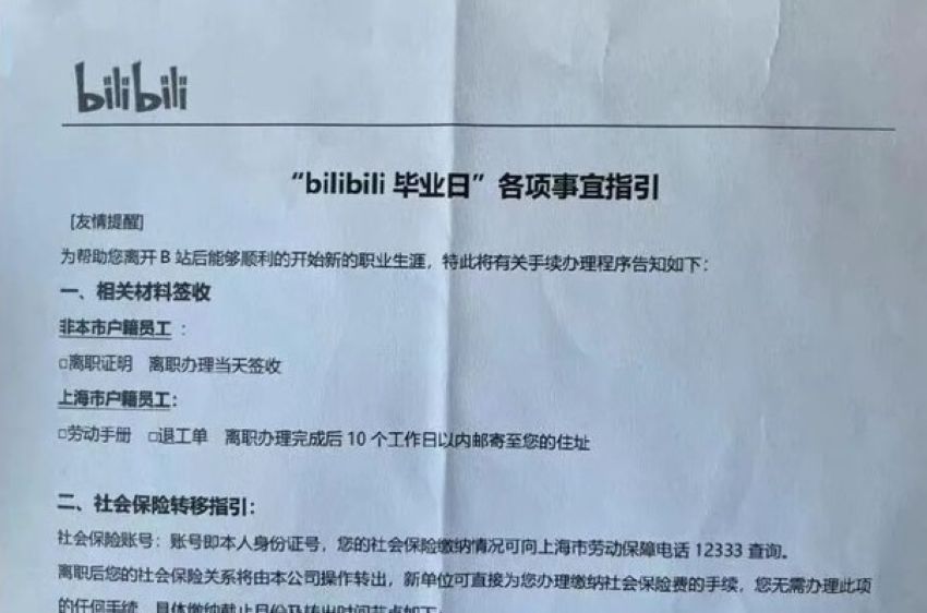 嗶哩嗶哩將被裁員工離職日美化為「bilibili畢業日」。