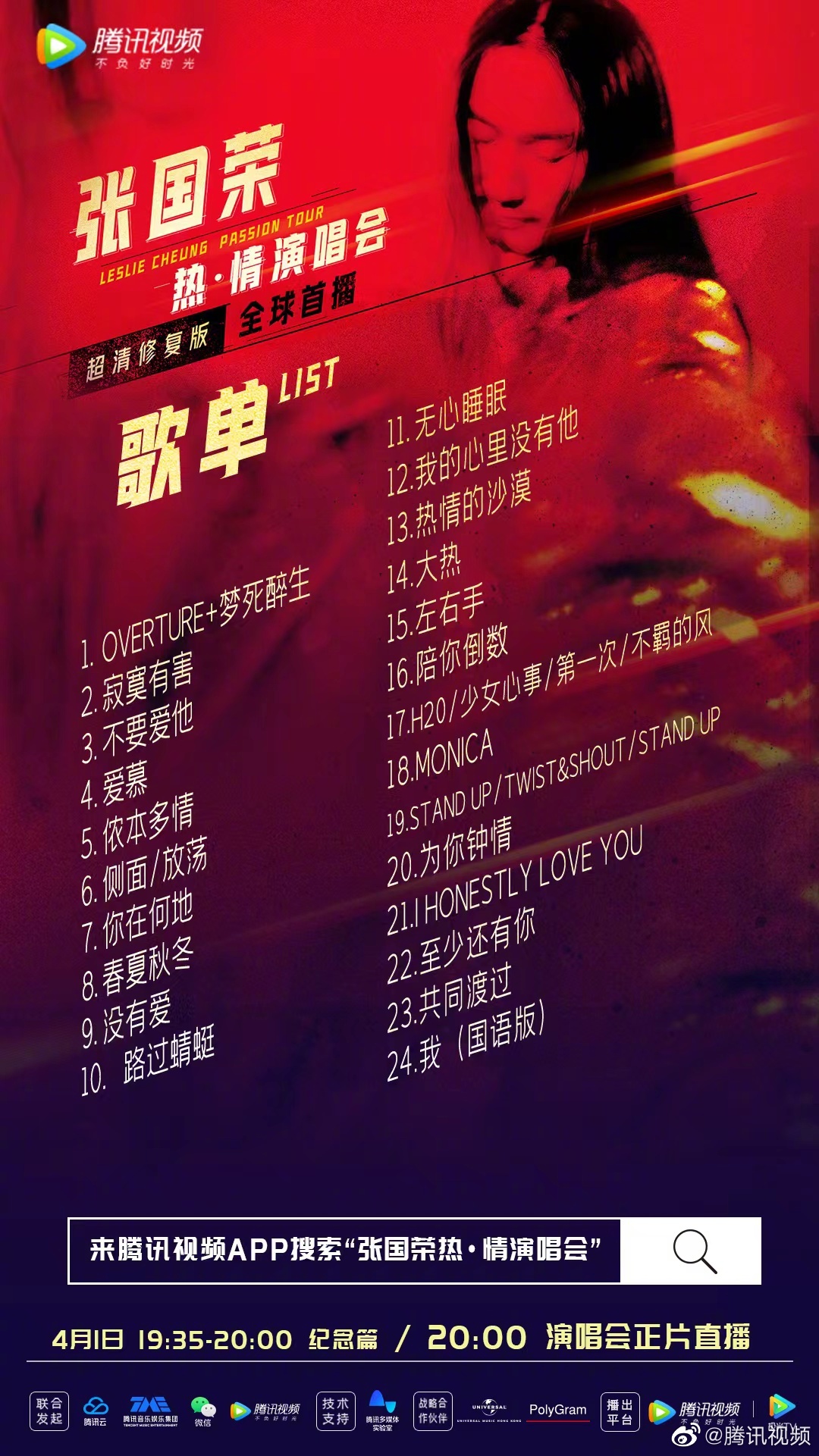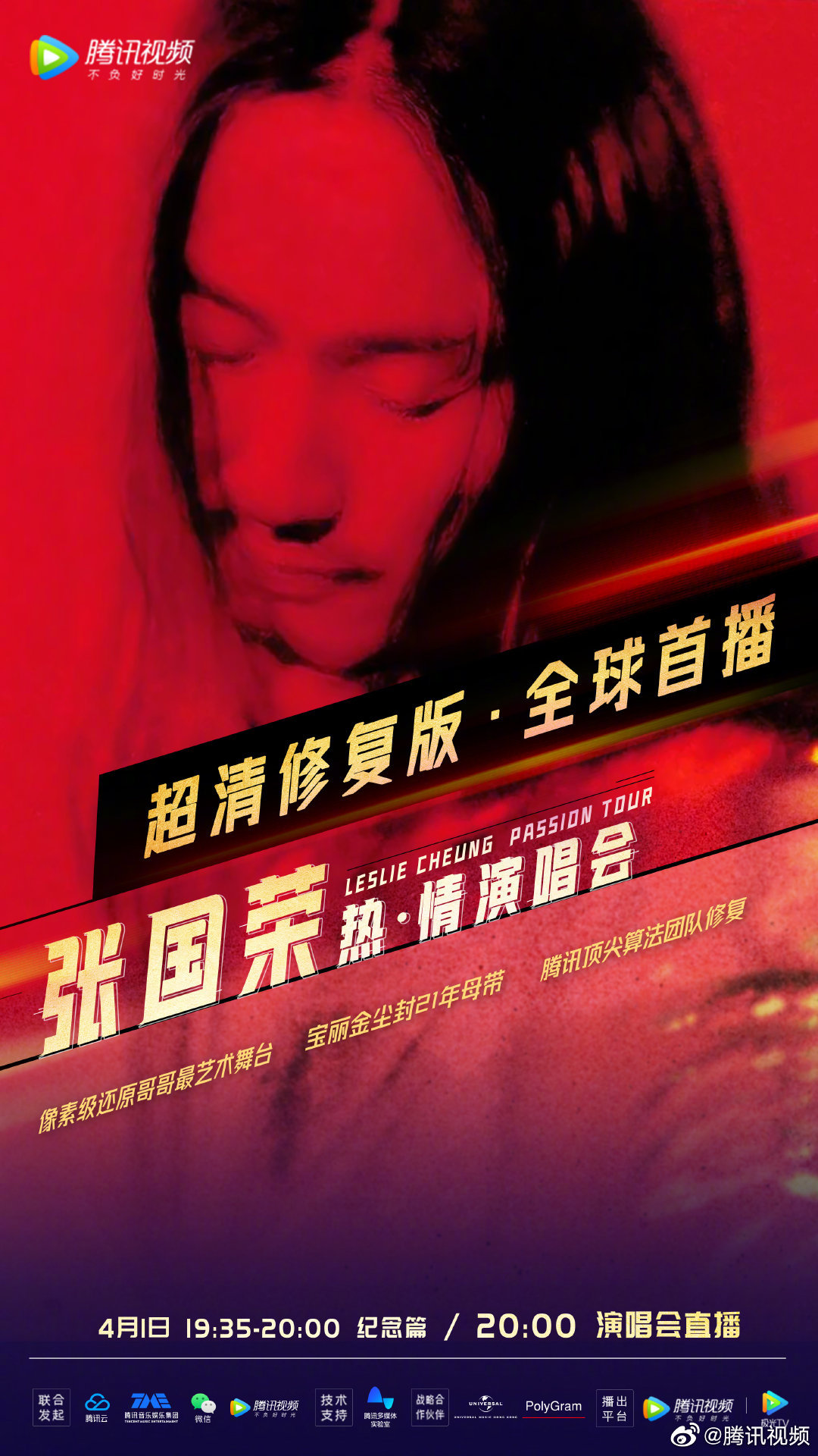 【橙訊】又到了四月一號,不知不覺「哥哥」張國榮已經離開大家19個年頭,而每年都有相關的紀念活動推出,以悼念這位傳奇藝人。今晚8時,張國榮「熱·情」演唱會超清修復版將於騰訊視頻線上首播(7時35分為紀念篇,8時為演唱會正片),而這也是這一超清修復版的全球首播。