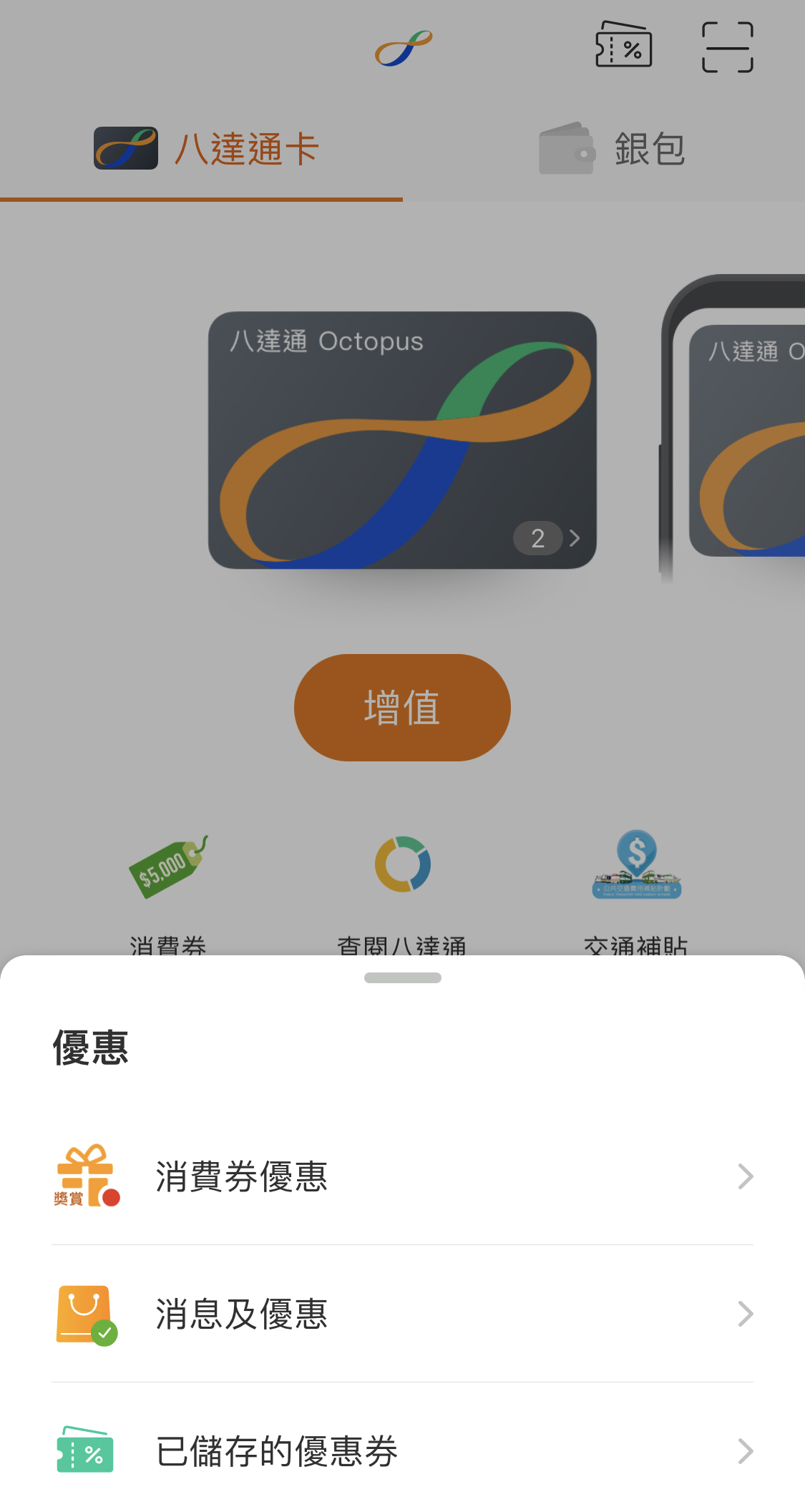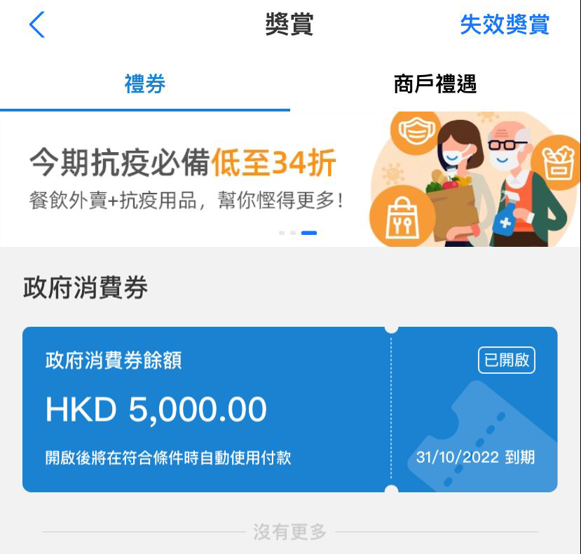 在八達通App下方正中「優惠」按鈕,可以查看消費券優惠券。