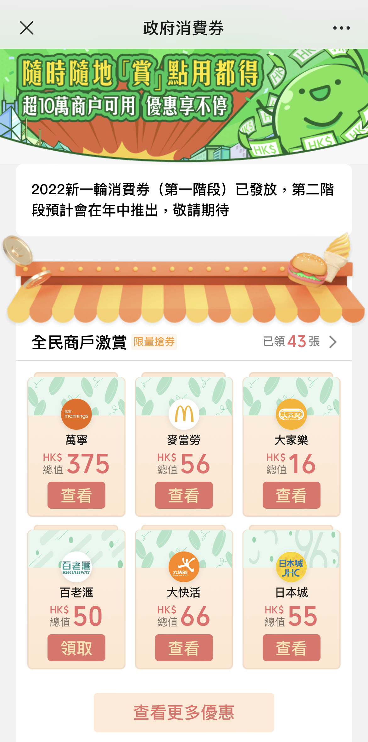 WeChat Pay HK已夥拍商戶準備優惠券,供用戶領取使用。目前App中的「政府消費券」版面設有多間商戶的限量搶券,包括大快活任何惠顧享3港元折扣、大家樂買滿30港元減3港元優惠券、McCafé 28港元兩杯熱意大利泡沫咖啡等。部分優惠券更已被搶空!
