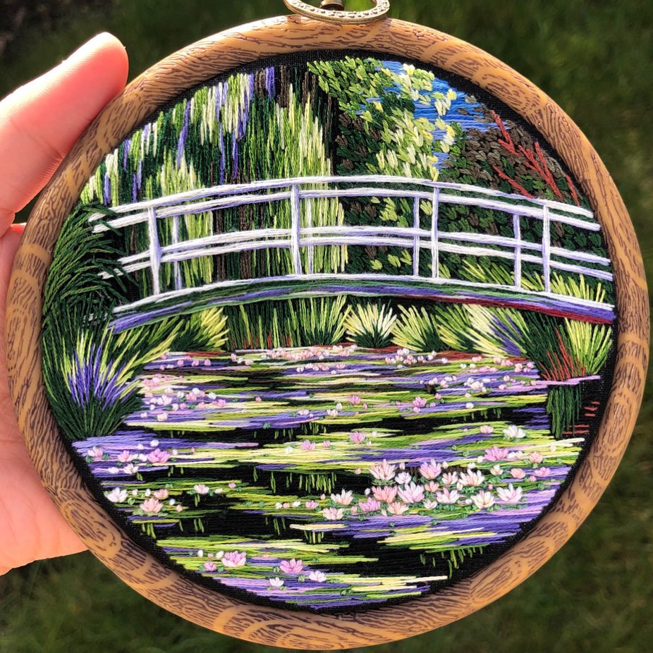 藝術家還在過往的作品中,以刺繡形式還原了莫奈的畫作,如這些: