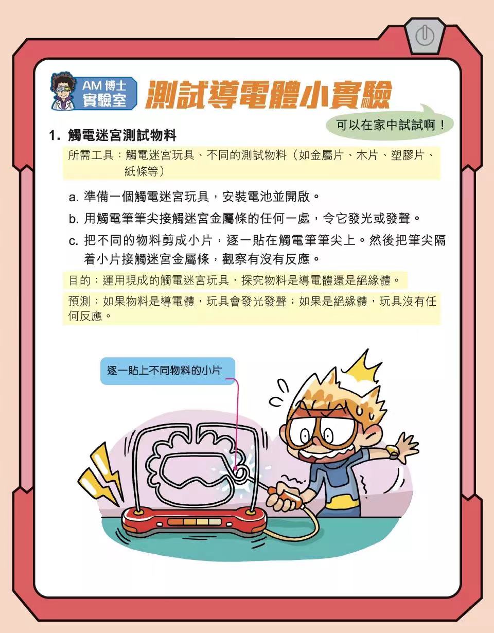 本書設有「實驗室」專欄,建議讀者利用家中道具做小實驗。閉合電路與導電物料有關,讀者可按照指引,測試各種物料的導電性。