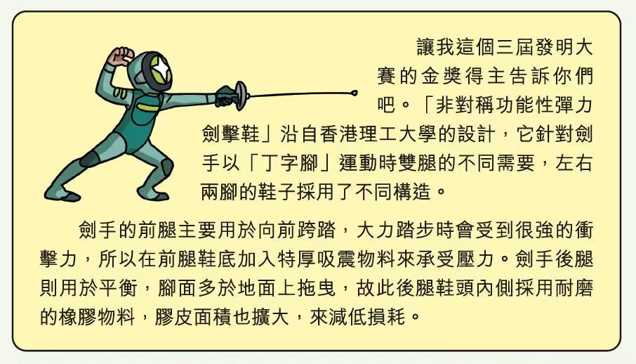 劍擊手的一身裝備,無論由面罩到鞋子,都集結了發明家的心血,針對每個細微之處而作出調整和重新設計。如果不是作者提到,你們知道原來劍擊手左右兩隻鞋的設計各有分別嗎?