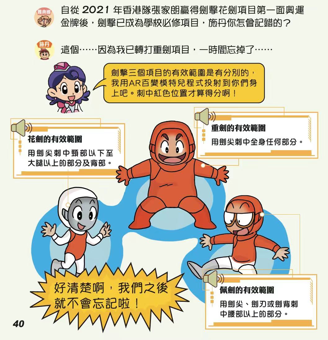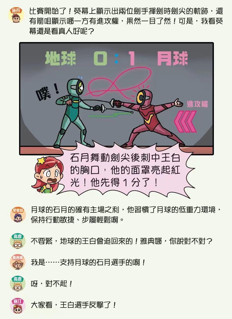 劍擊比賽期間令人眼花燎亂,有時觀眾連誰打中誰都看不清楚。所以,現時科技界正在研發「可視化系統」,在AR(擴增實境)的技術輔助下,屏幕會即時在影像上加添各種指示。觀眾只要看着屏幕,便能知道劍尖的光影軌跡,知道誰人有優先權。這效果實際如何運用?本書活靈活現地將之表現出來。