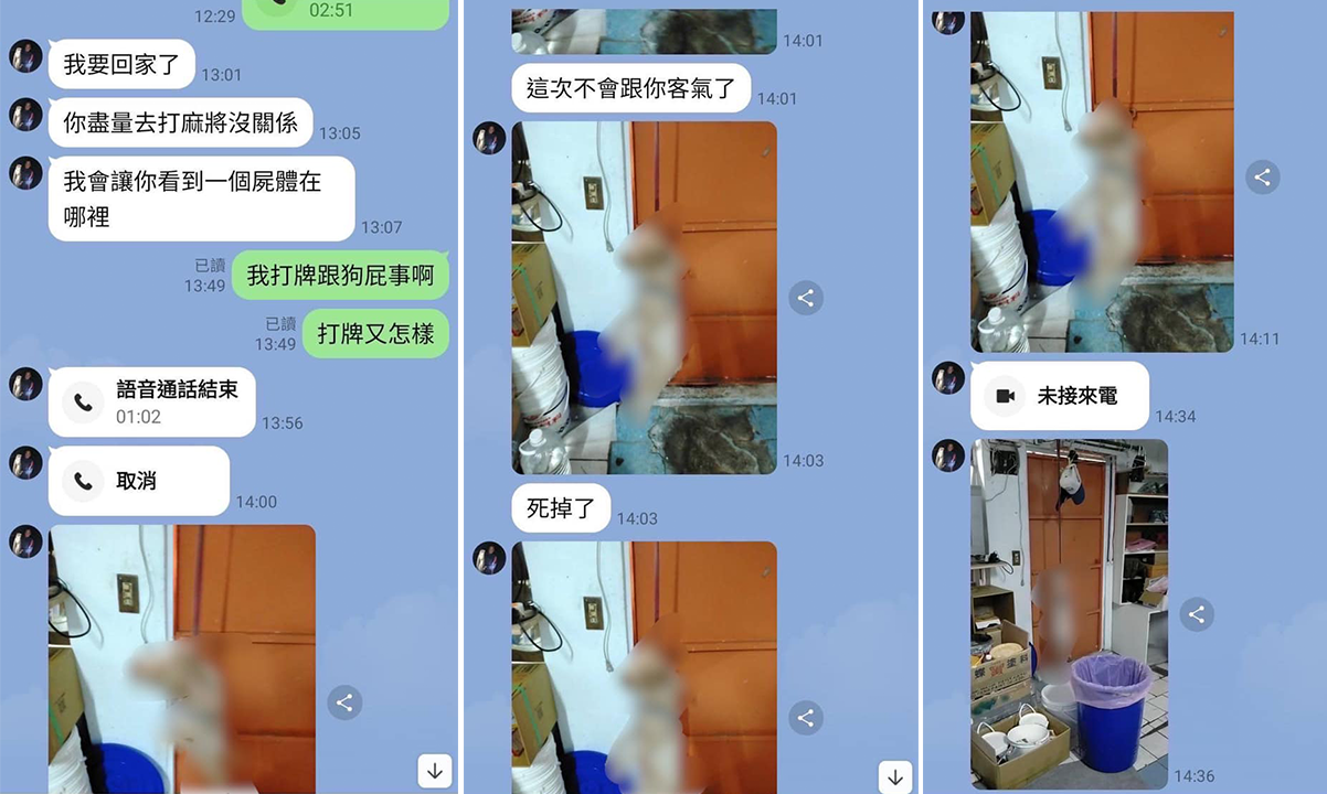 涉事男子與女友的對話紀錄顯示,男子語帶威脅稱:「你盡量去打麻將沒關係,我會讓你看到一個屍體在那裡」,更拍下多張照片,將小狗的「死亡直播」傳給女友,說道:「這次不會跟妳客氣了」、「死掉了」。整段虐殺小狗過程相當可怕。