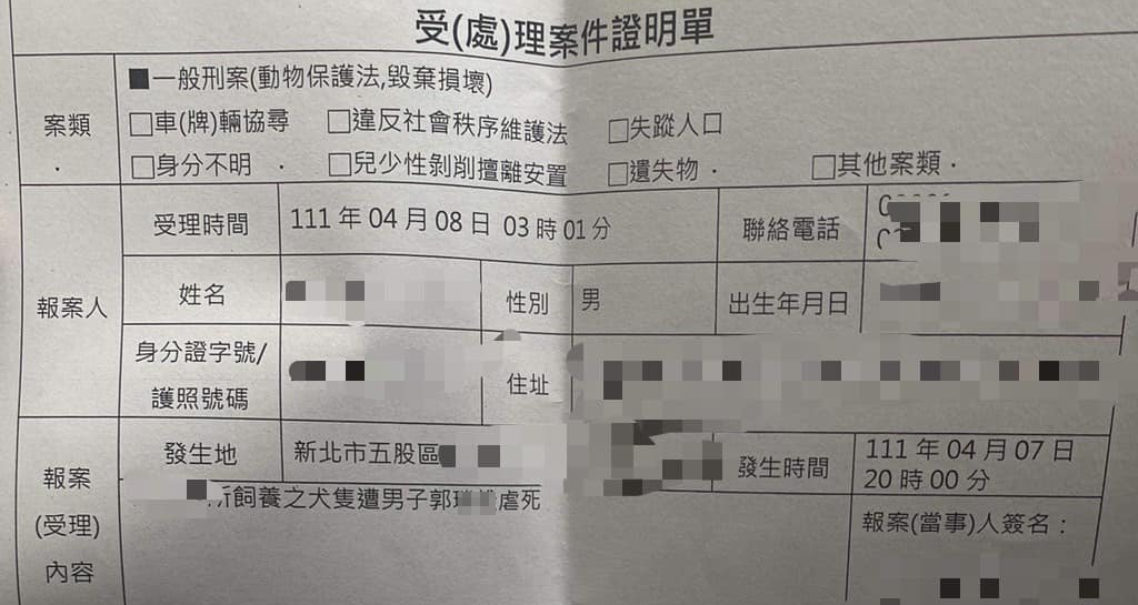 新竹市一所流浪動物協會協助受害家屬處理案件,目前派出所以及動保處都已成案,違反動物保護法及毀損罪都涉及刑事責任。協會嚴厲譴責此人的變態行為,而且指出他在案後根本毫無悔意,該會懇請執法單位務必嚴罰,「這種人會是一顆不定時的炸彈,因為情緒上來就虐殺生命,務必要持續追蹤。」