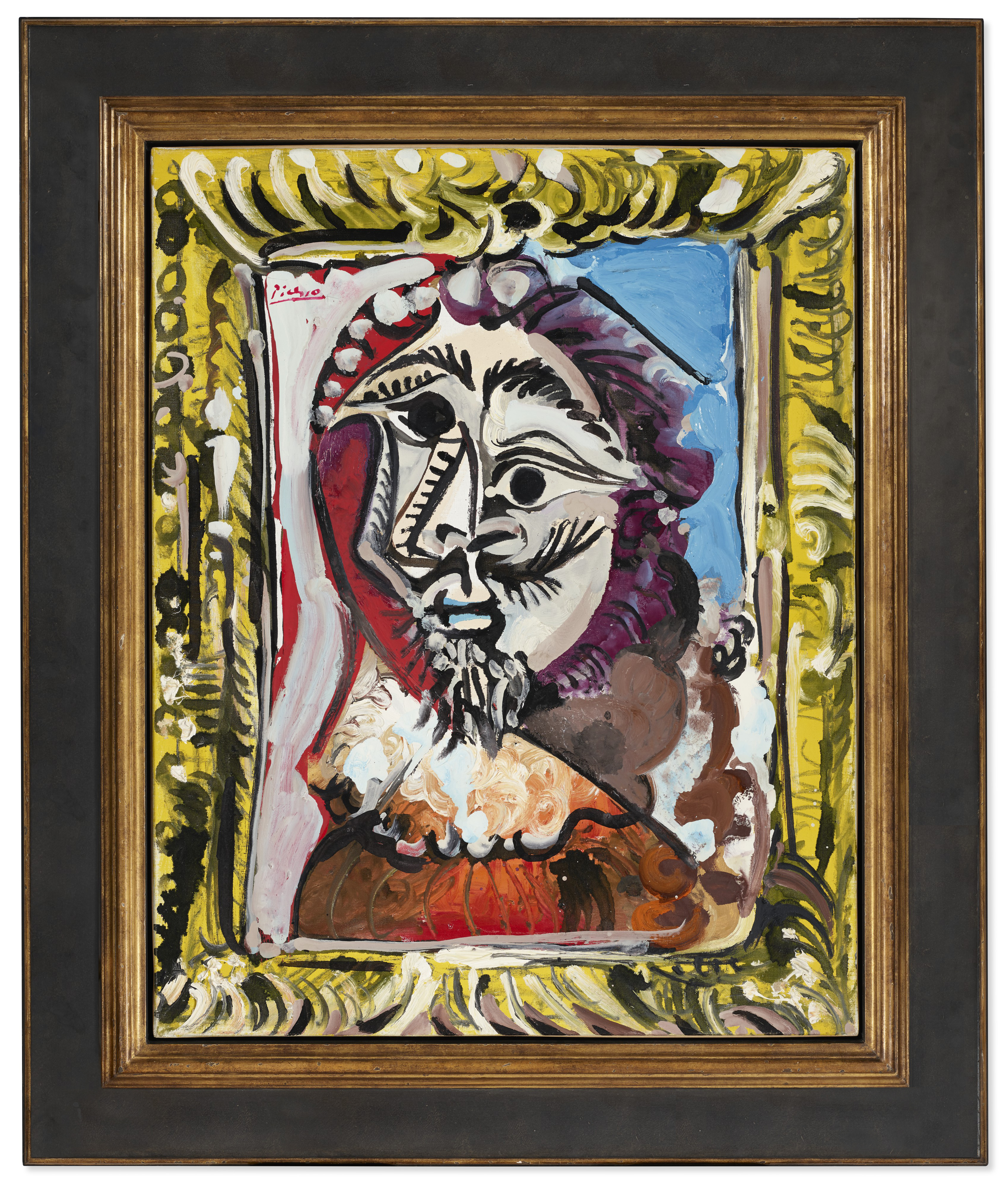 《畫框中的男子半身像》是畢加索的經典主題「火槍手」系列的代表作之一。畢加索以十七世紀威風凜凜、充滿男子氣概的火槍手形象為原型,汲取黃金年代大師的畫作,如倫勃朗(Rembrandt)和維拉斯奎茲(Velázquez)等之精華,並受到莎士比亞(Shakespeare)和大仲馬(Dumas)等文壇巨擘創作的啟發。