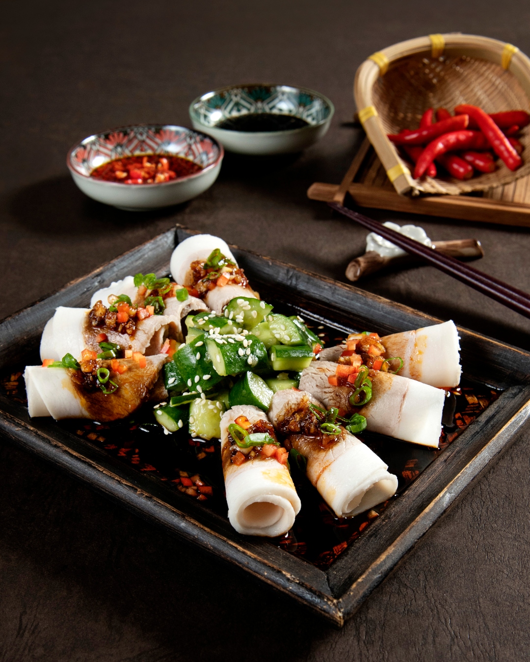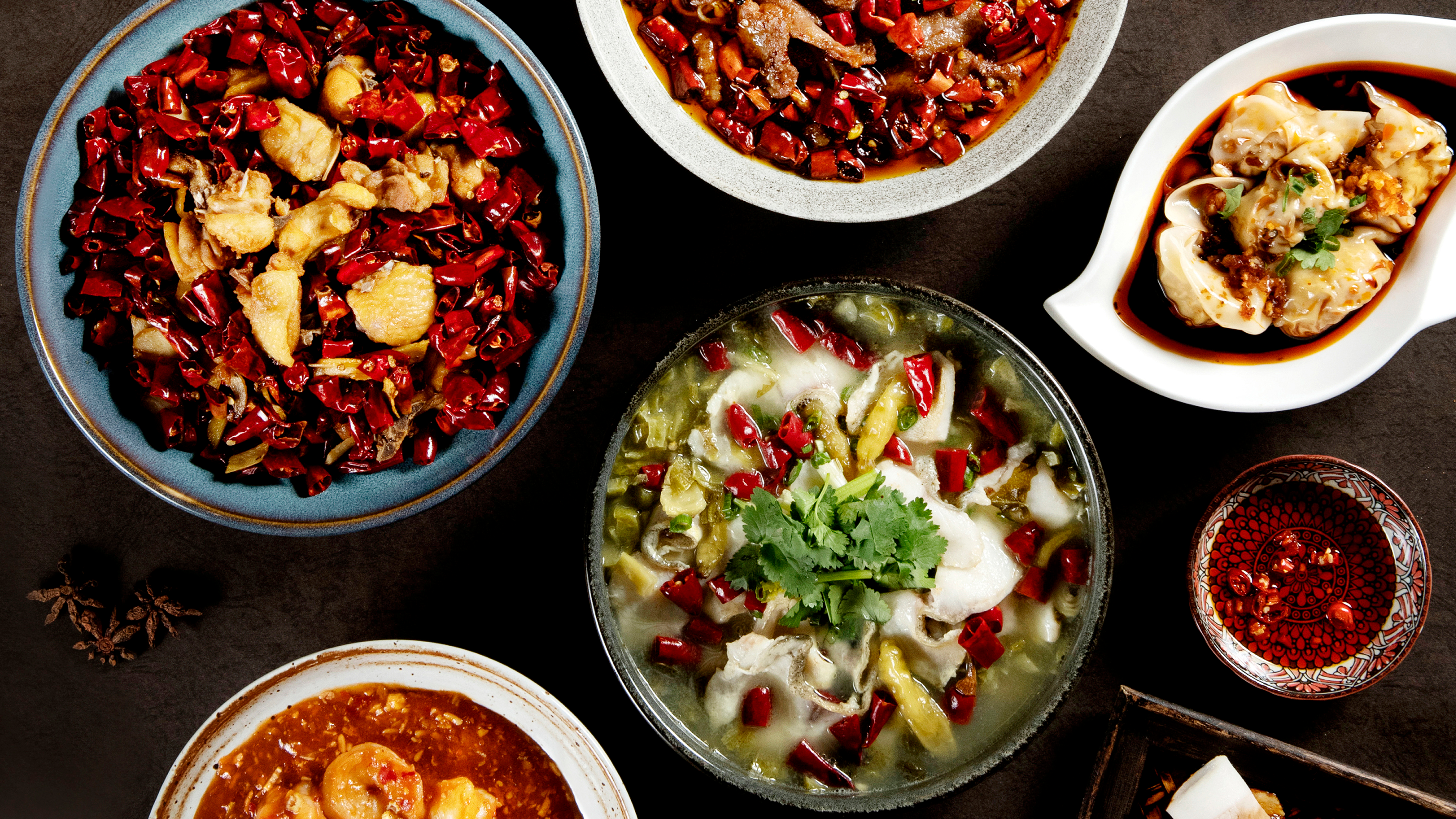 由陳啟德師傅主理的一系列川菜包括「夫妻肺片」($88)、「重慶口水雞」($118)、「雲片白肉」($88)、「滋味酸菜魚」($148)、「水煮牛肉」($148)、「歌樂山辣子雞」($108)、「魚香蝦球」($108)、「老四川紅燒牛腩」($98)、「馳名擔擔麵」($68)、「紅油抄手」($68)及「紅糖糍粑」($38)。1菜式橫跨四川涼菜、麵食至甜品,除了「歌樂山辣子雞」及「老四川紅燒牛腩」,其餘則為傳統川菜。是次的新品辣度不一,能照顧不同喜好的食客。