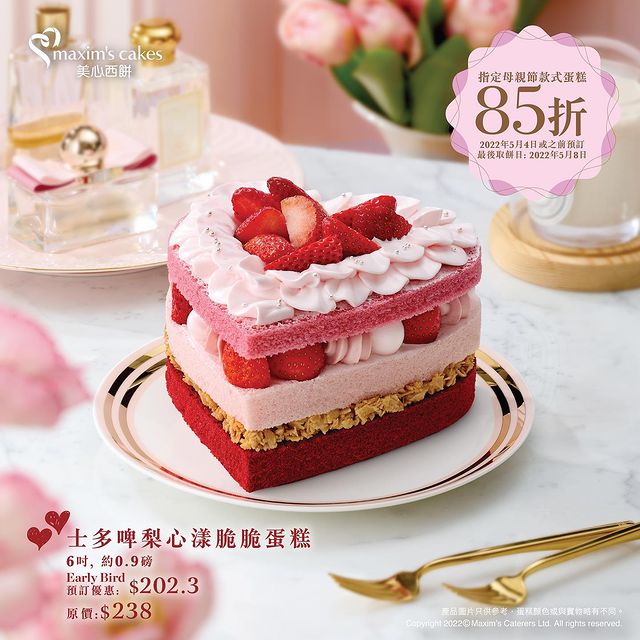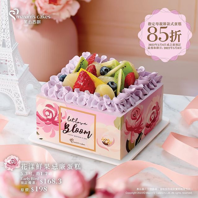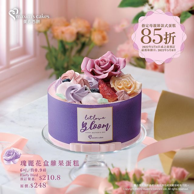 品牌另外推出三款專為母親節而設的蛋糕,「瑰麗花盒雜果蛋糕」($248/6吋)揉合流行花藝美學,以粉紅玫瑰及香檳玫瑰為主調,配以巧手忌廉唧花,猶如一個精緻的韓式鮮花花盒,適合鍾情花藝美學或愛花的媽媽們。