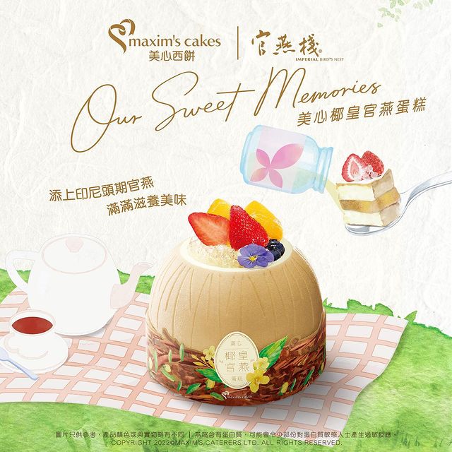 美心西餅是次首度與官燕棧合作,推出全新的「美心椰皇官燕蛋糕」($268/6吋)。蛋糕內有桂花啫喱、梨肉及招牌白朱古力脆脆作為夾心,每個椰奶慕絲蛋糕更會附贈由官燕棧特別研發的「豐‧頭期官燕」一份,選用印尼一年一造及真材實料的頭期燕窩。燕窩極具滋陰潤燥的功效,入口滑捋捋。大家不妨將燕窩倒入蛋糕,讓媽媽倍感滋潤。
