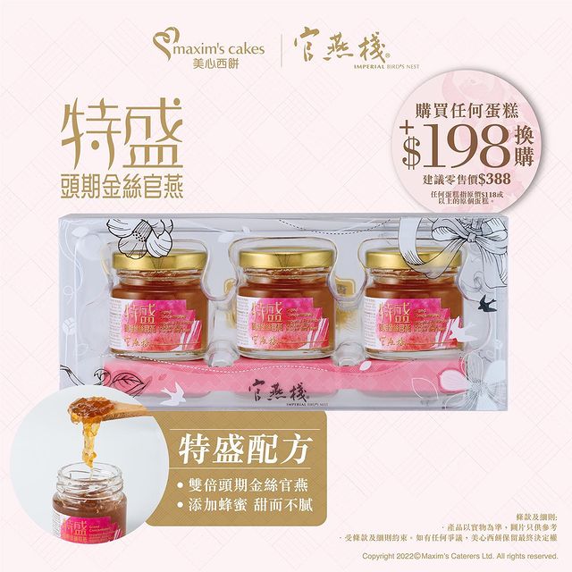 美心西餅門市推出獨家禮遇,凡購買任何蛋糕,即可以$198即可加購「官燕棧特盛頭期金絲官燕禮盒裝」