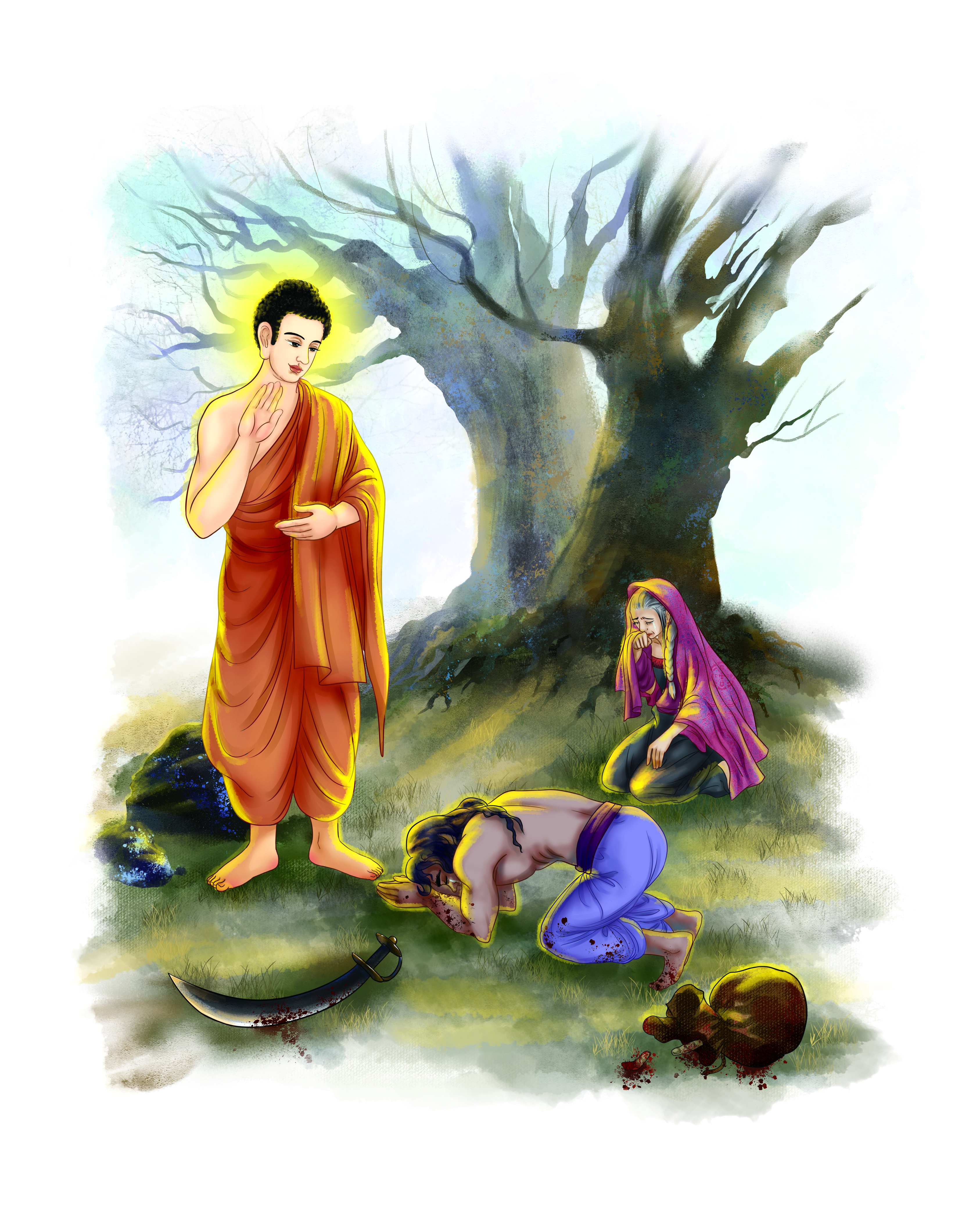 幸好佛陀及時出現,引導他恢復理性,阻止了他弒母的衝動,並為他開示,讓他懂得自省悔改,最終皈依佛法,成為了佛陀最精進修行的弟子之一,不久更證得了阿羅漢的果位。