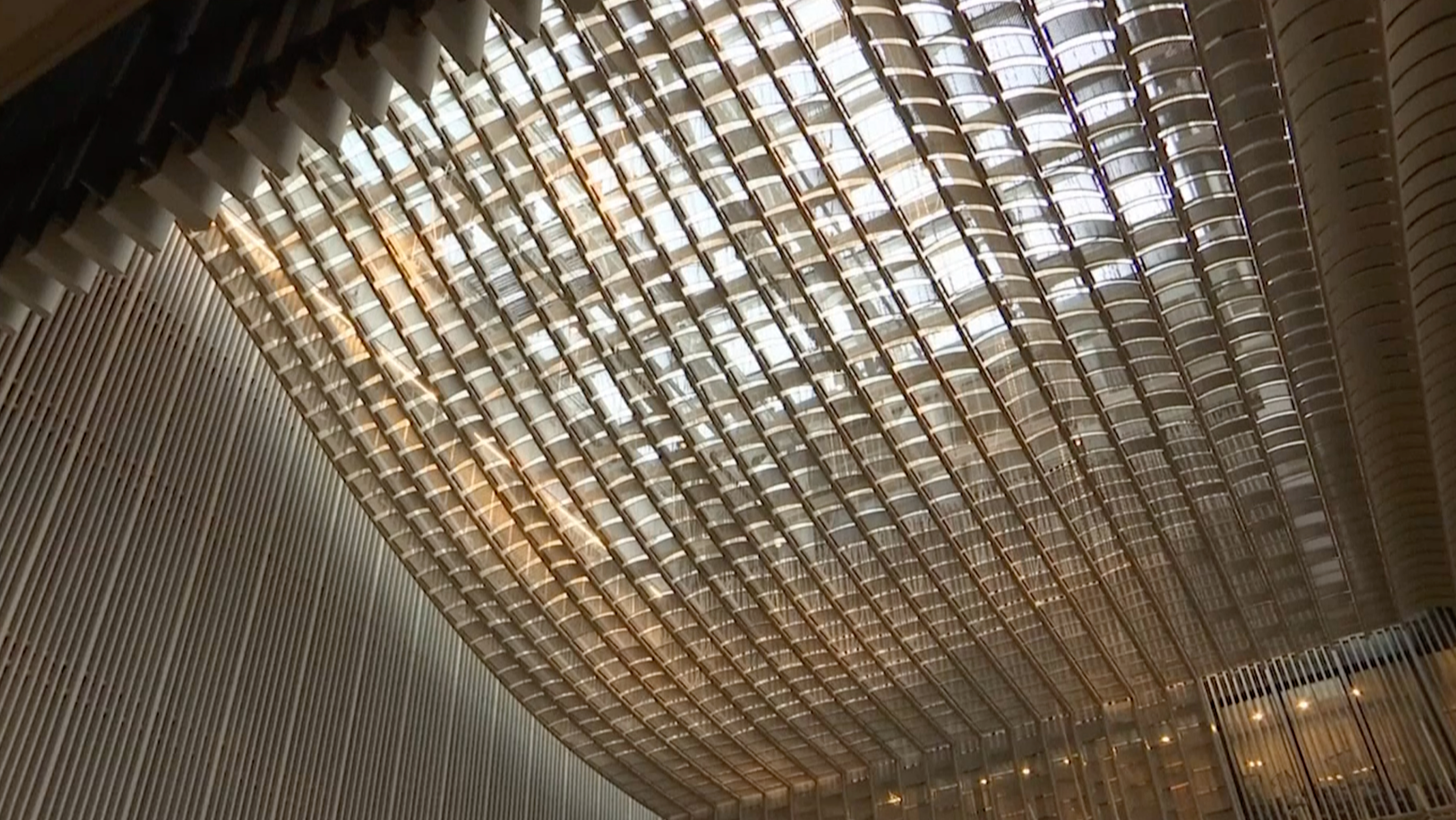中庭的金色天花參照紫禁城屋頂的琉璃瓦設計。影片截圖
