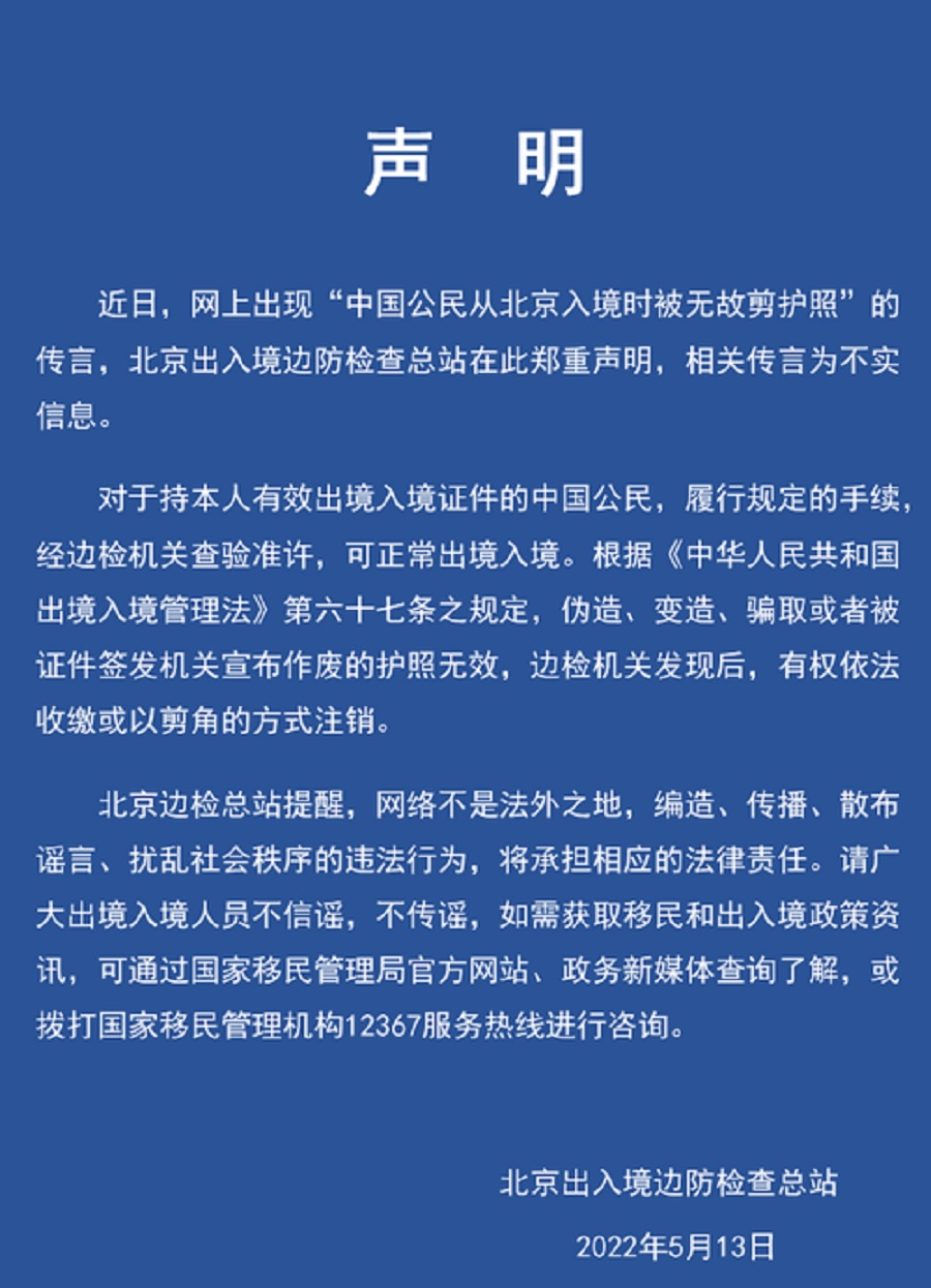 網上近日出現「中國公民從北京入境時被無故剪護照 」的傳言,北京出入境邊防檢查總站發出鄭重聲明,指相關傳言為不實信息,對於持本人有效出境入境證件的中國公民,履行規定的手續,經邊檢機關查驗準許,可正常出境入境。
