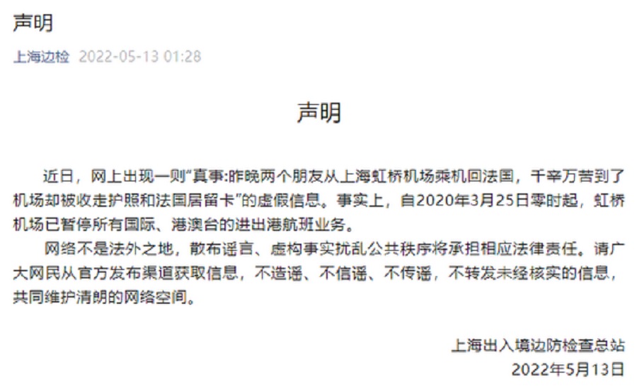 上海邊檢亦回應虹橋機場乘機被收走護照和法國居留卡一事,指網上近日出現一則事件,「昨晚兩個朋友從上海虹橋機場乘機回法國,千辛萬苦到了機場卻被收走護照和法國居留卡」的虛假信息。事實上,自2020年3月25日零時起,虹橋機場已暫停所有國際、港澳台的進出港航班業務。