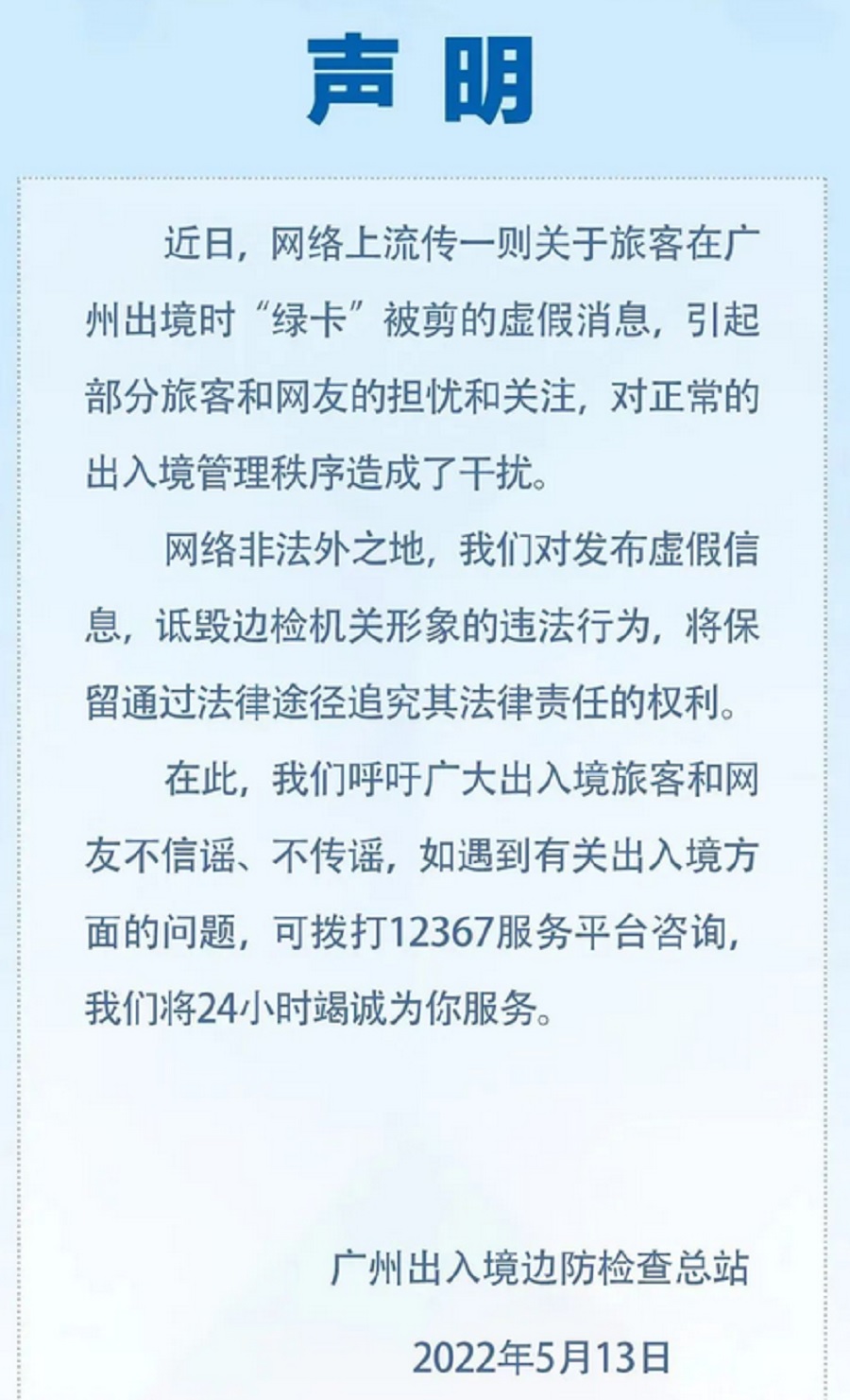 廣州邊檢亦回應旅客在廣州出境時「綠卡」被剪傳聞。廣州邊檢指,網絡上近日流傳一則關於旅客在廣州出境時「綠卡」被剪的虛假消息,引起部分旅客和網友的擔憂和關注,對正常的出入境管理秩序造成了干擾。