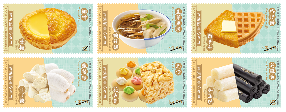 這次發行的「香港懷舊小食II」系列精心挑選了6款令人回味無窮的懷舊小食作為主題,包括蛋撻、生菜魚肉、格仔餅、龍鬚糖、馬仔及芝麻卷等。郵票小型張的齒孔印有香港的英文縮寫「HK」,獨具香港特色,小型張則展示另外三款經典小食,包括臭豆腐、燒賣和以獨特方式售賣的「飛機欖」。