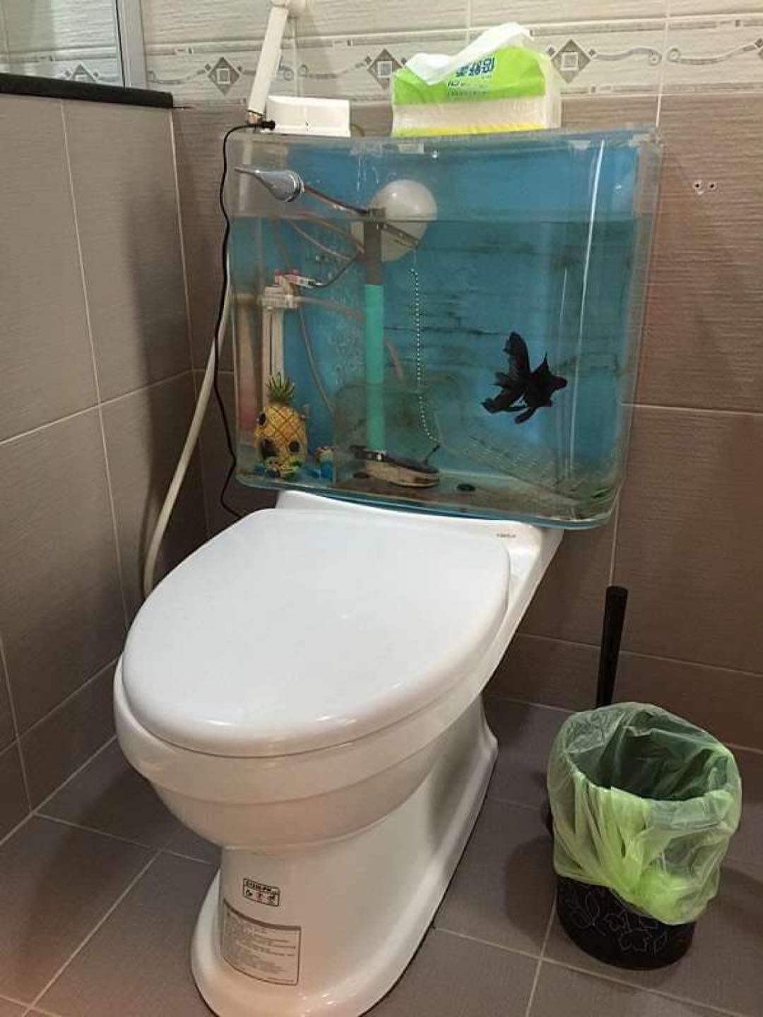 近日有網民分享台灣一家民宿在「馬桶養魚」的奇怪操作,照片中的馬桶水箱被改造成「透明魚缸」,備有沖水手把、浮球、止水閥、水管等馬桶設備的同時,入面還放有魚缸造景,且養有一條疑似是黑色的金魚。如此一來,每次沖水都會對水箱內的魚造成衝擊,再加上廁所的污染問題嚴重,以及加氯自來水本身亦對金魚有害。