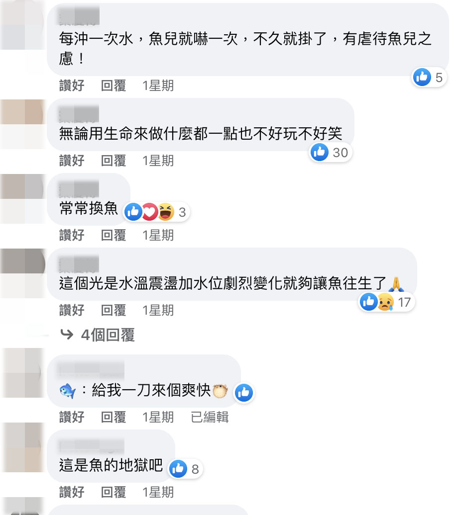 網友紛紛譴責設計,「換水換的這樣急,金魚死定了,這絕對是虐待動物」、「這個光是水溫震盪加水位劇烈變化就夠讓魚往生了」、「就算不是加氯自來水,水沖下去放新的水的時候,溫度過大會導致金魚心臟壓力太大死亡喔」、「魚也太可憐了吧」,不過也有人認為「馬桶養魚」的想法很好,只要「換成假魚就很棒」。另外,據知情網友透露,該設計源於台東一家民宿,他們也早已改掉這個裝潢設計很久。