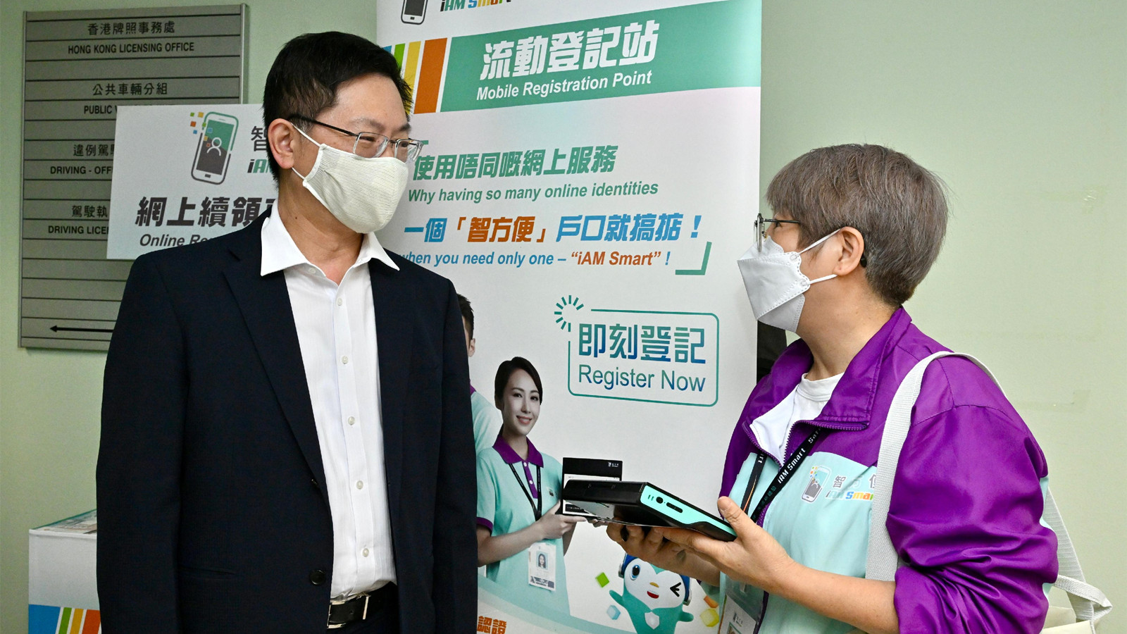 【橙訊】政府資訊科技總監辦公室今日起,陸續於運輸署四個牌照事務處安排流動登記隊,協助市民登記成為「智方便」用戶。創新及科技局局長薛永恒早上到其中一個事務處視察,表示希望讓車主有多一個選擇,如果已登記備有數碼簽署功能的「智方便+」,就可以鬆在網上簽署及遞交續牌申請,省卻親身排隊輪候的時間。