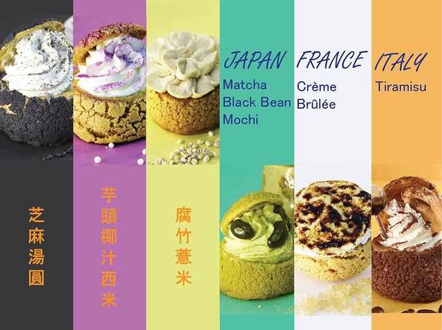賣相黑漆漆的「芝麻湯圓泡芙」以竹炭菠蘿皮泡芙包裹黑芝麻吉士、麻糬內餡,面層特別綴以黑芝麻香緹忌廉,煙韌的口感就如在品嚐中式湯圓。