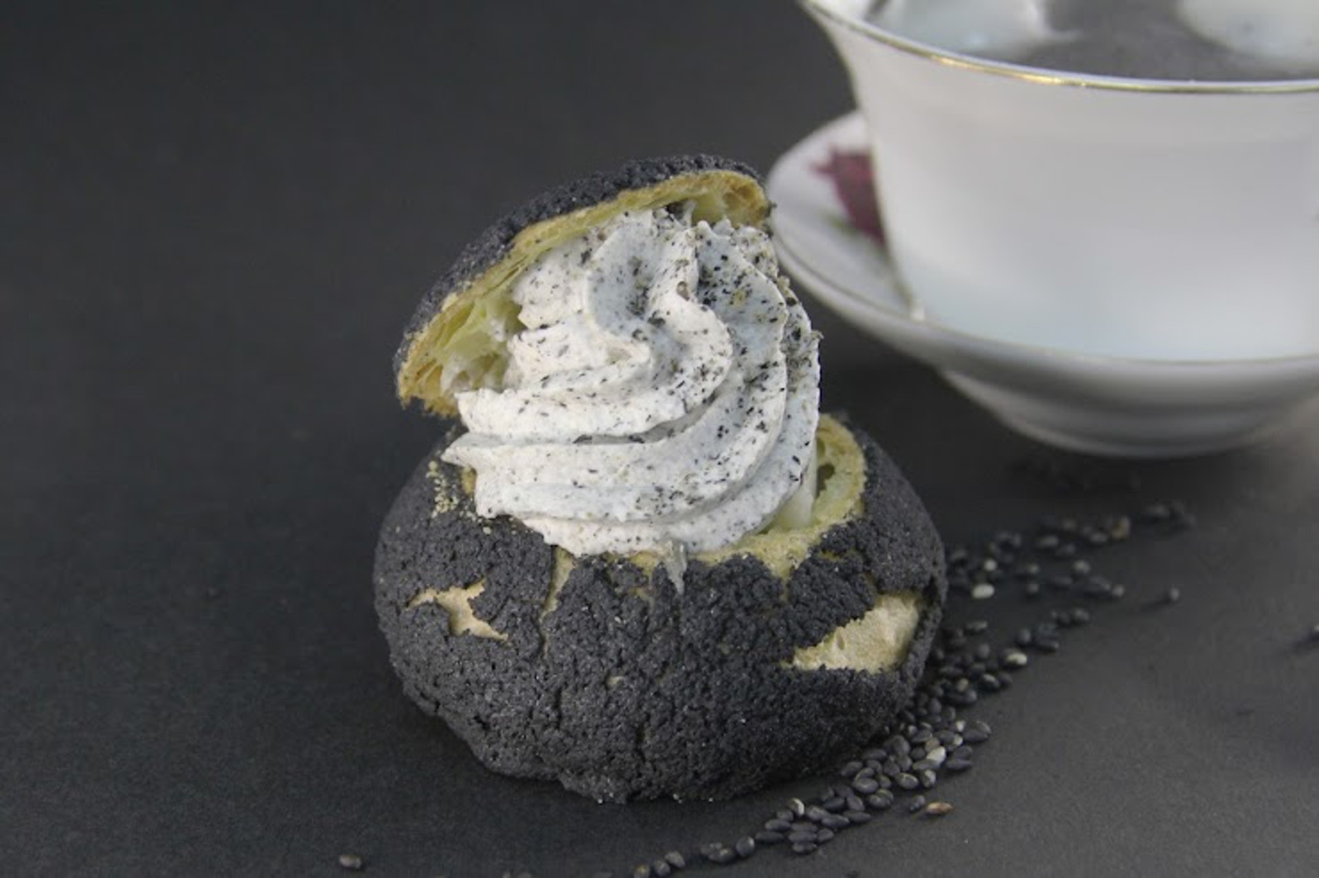 賣相黑漆漆的「芝麻湯圓泡芙」以竹炭菠蘿皮泡芙包裹黑芝麻吉士、麻糬內餡,面層特別綴以黑芝麻香緹忌廉