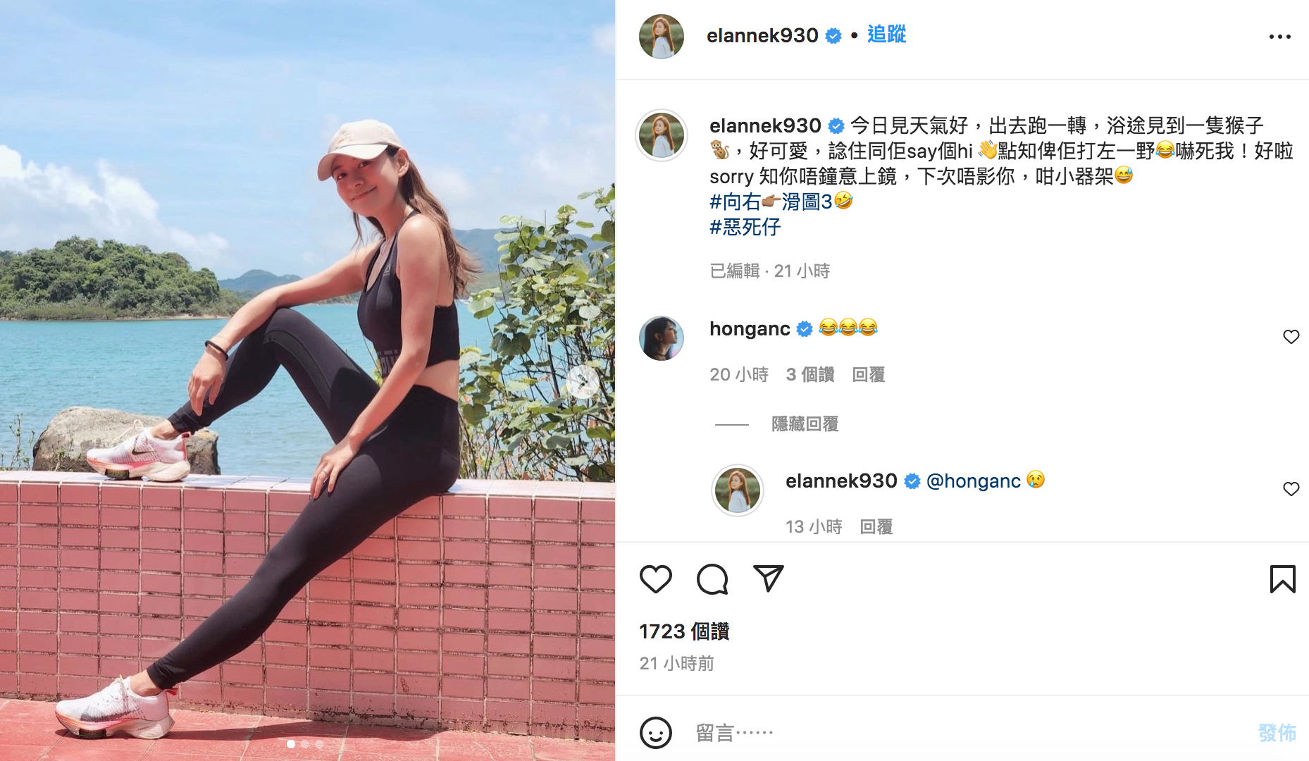 江若琳外出跑步巧遇野生猴子。