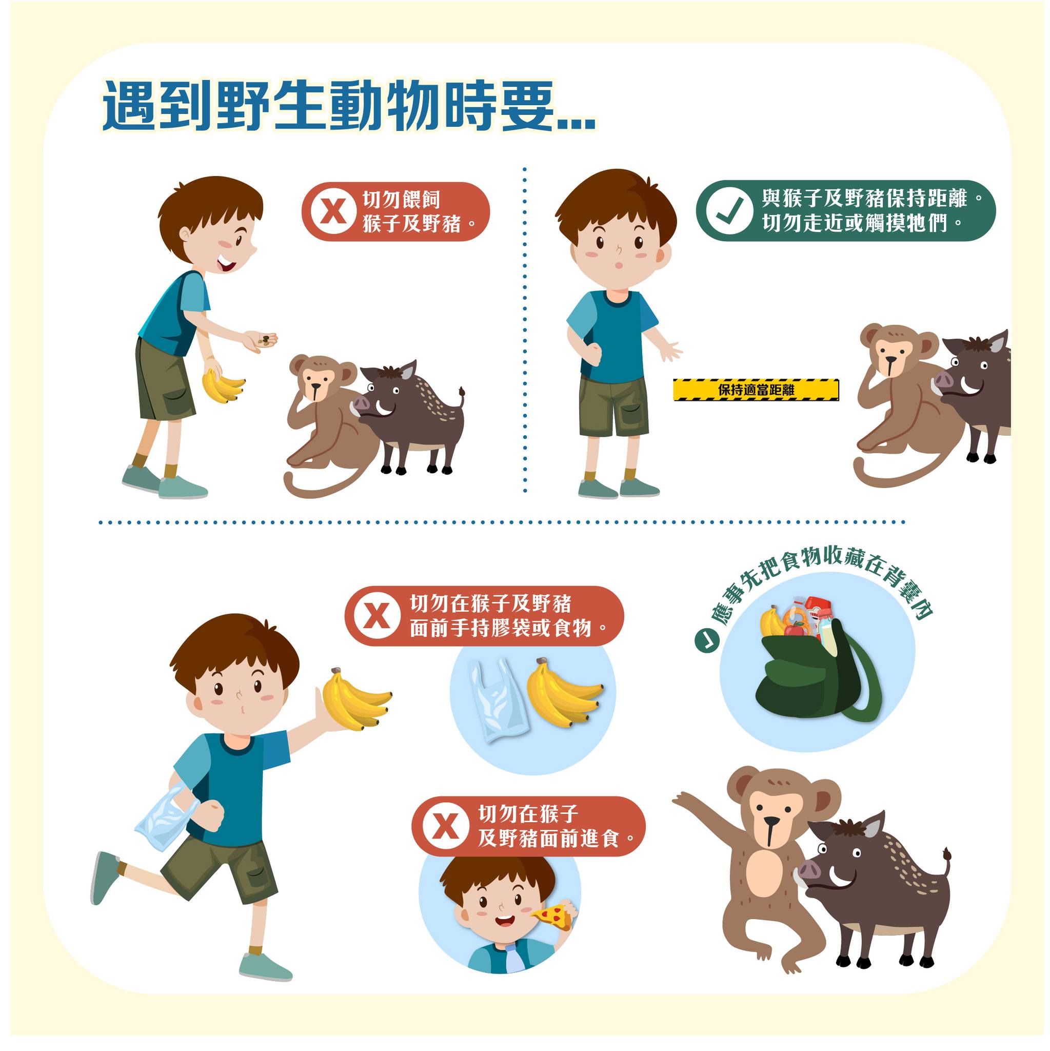 根據漁護署指引,遇到猴子應保持冷靜及不用慌張,而且不可釘視猴子,因為對猴子來說,四目交接是一種挑釁行為。不要走近或觸摸猴子,特別是幼猴,應與牠們保持距離。