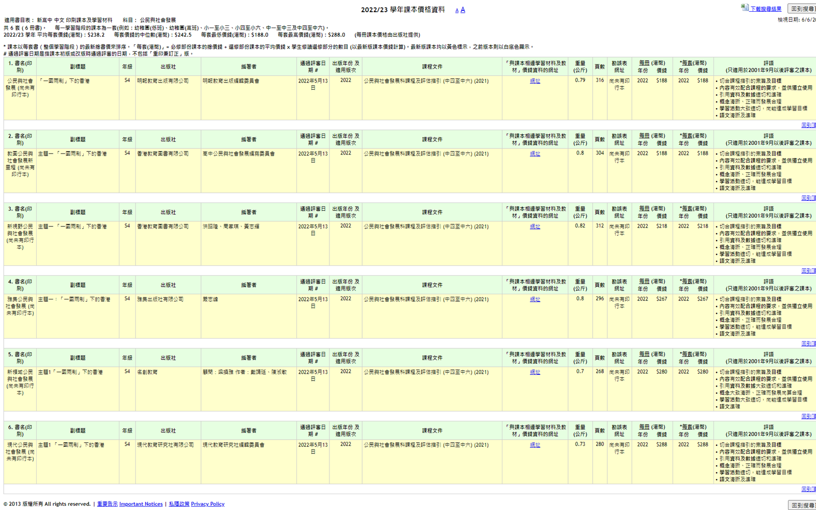 【橙訊】經過去年未有經送審課本可使用公民與社會發展科,教育局下午公布該科的「適用書目表」,共有六家出版社獲批,供學校選用。教科書價錢由188元至288元不等,平均價錢為約238元。不過,六套教科書仍未有印行本。