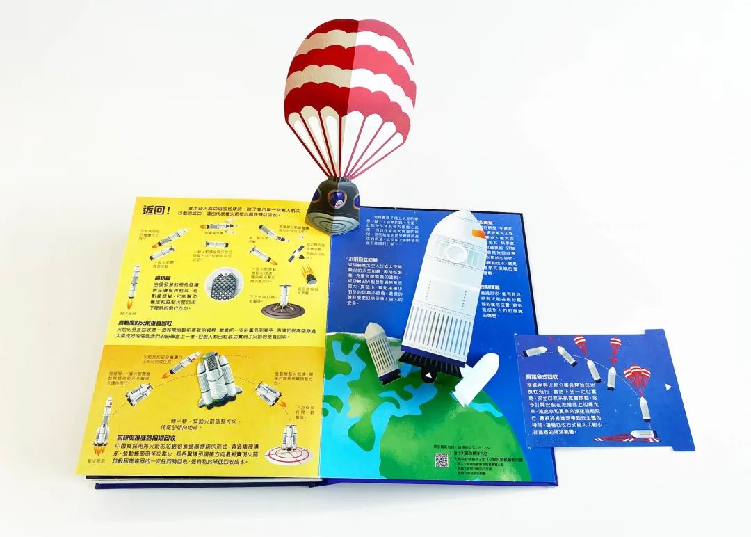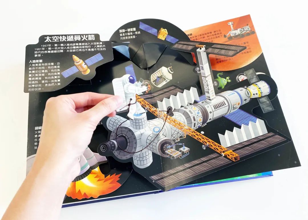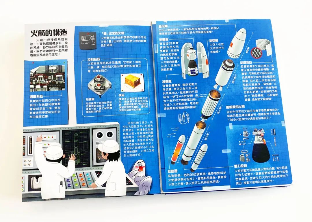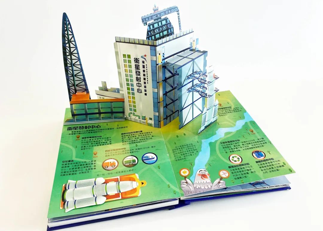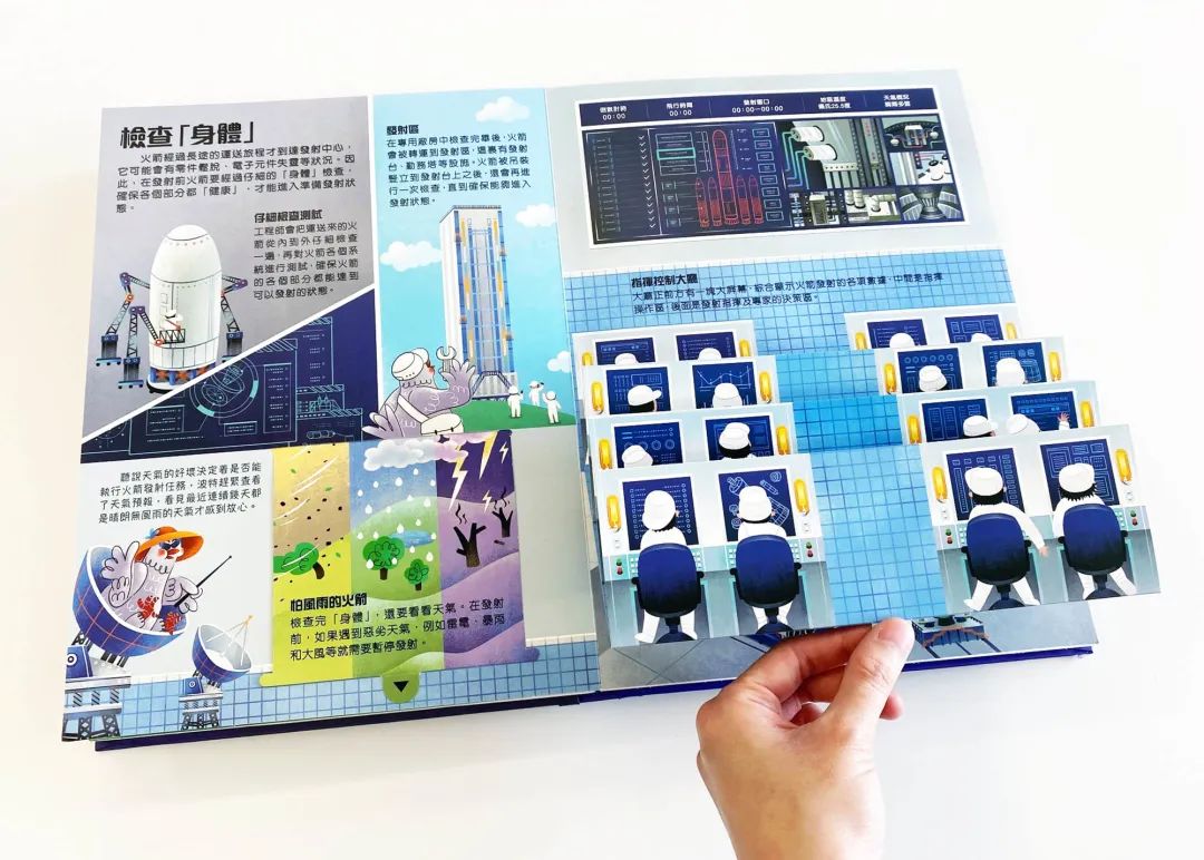 書內有豐富的立體場景,讓小讀者認識火箭的製造過程、各種航天工作,以及衛星發射中心等。