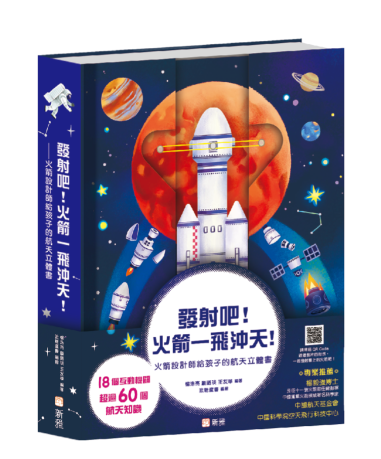 《發射吧!火箭一飛沖天!──火箭設計師給孩子的航天立體書》,由中國火箭設計師專家團隊傾力打造,此書設計獨特,封面附有可發射的「小火箭」道具,好玩有趣,先激發小朋友對火箭的好奇心。書內有18個互動機關,超過60個航天知識讓孩子一一探索!