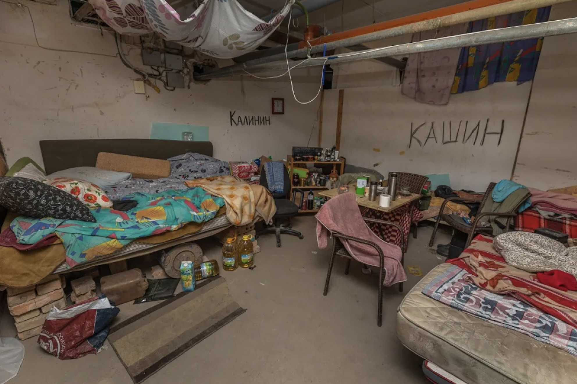 除了戰爭的殘骸,展覽還透過還原地下的庇護所,讓人們了解到烏克蘭人戰時苦況。館內模擬鄰近基輔機場的臨時防空庇護所,並試圖完整呈現當時場景——在地庫構建3個房間,甚至連牆上的塗鴉亦保留下來。當時,約有120人在臨時庇護所渡過了37天,那裡沒有電、沒有暖氣,環境非常惡劣。從貨架上的食物罐頭到使用的毯子,這些細節亦有保留下來,館方還試圖重現庇護所的氣味,讓觀者親身感受當時的衛生條件。