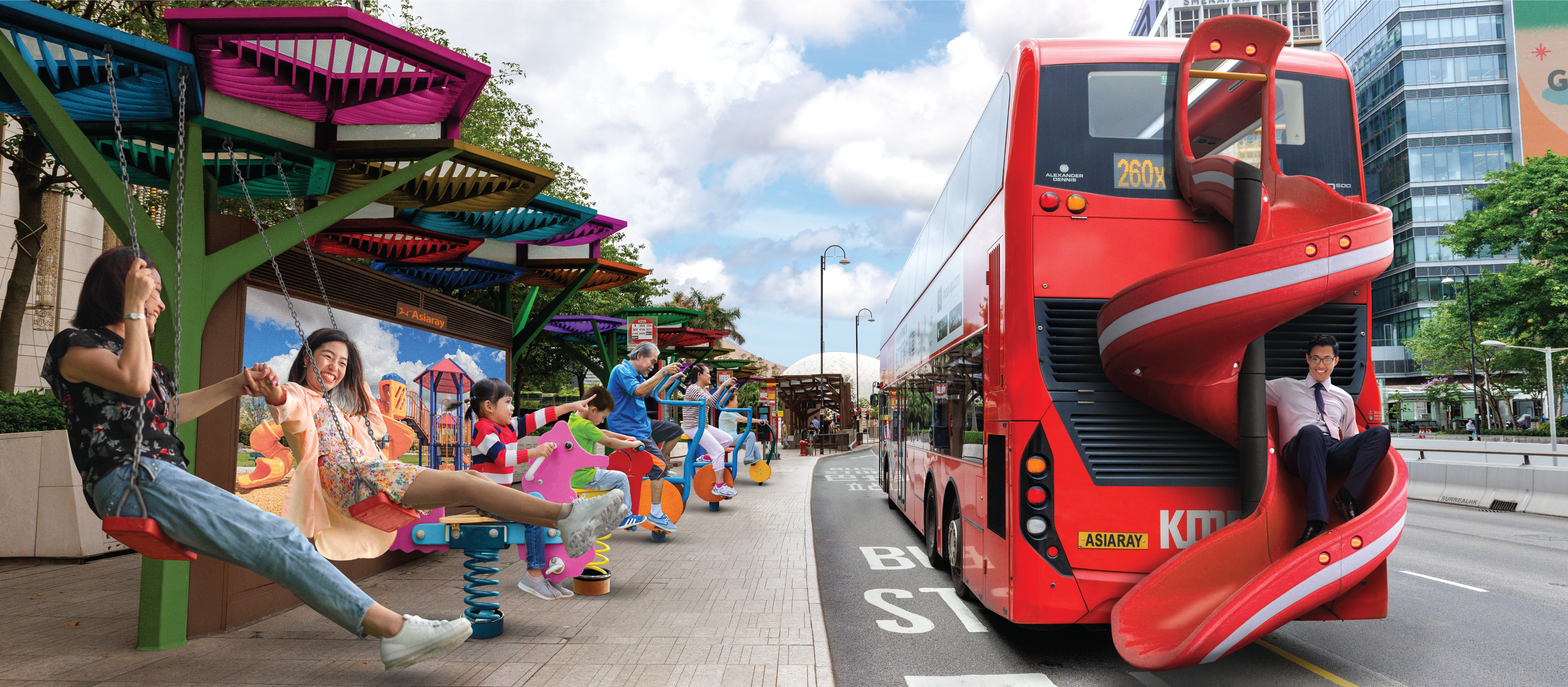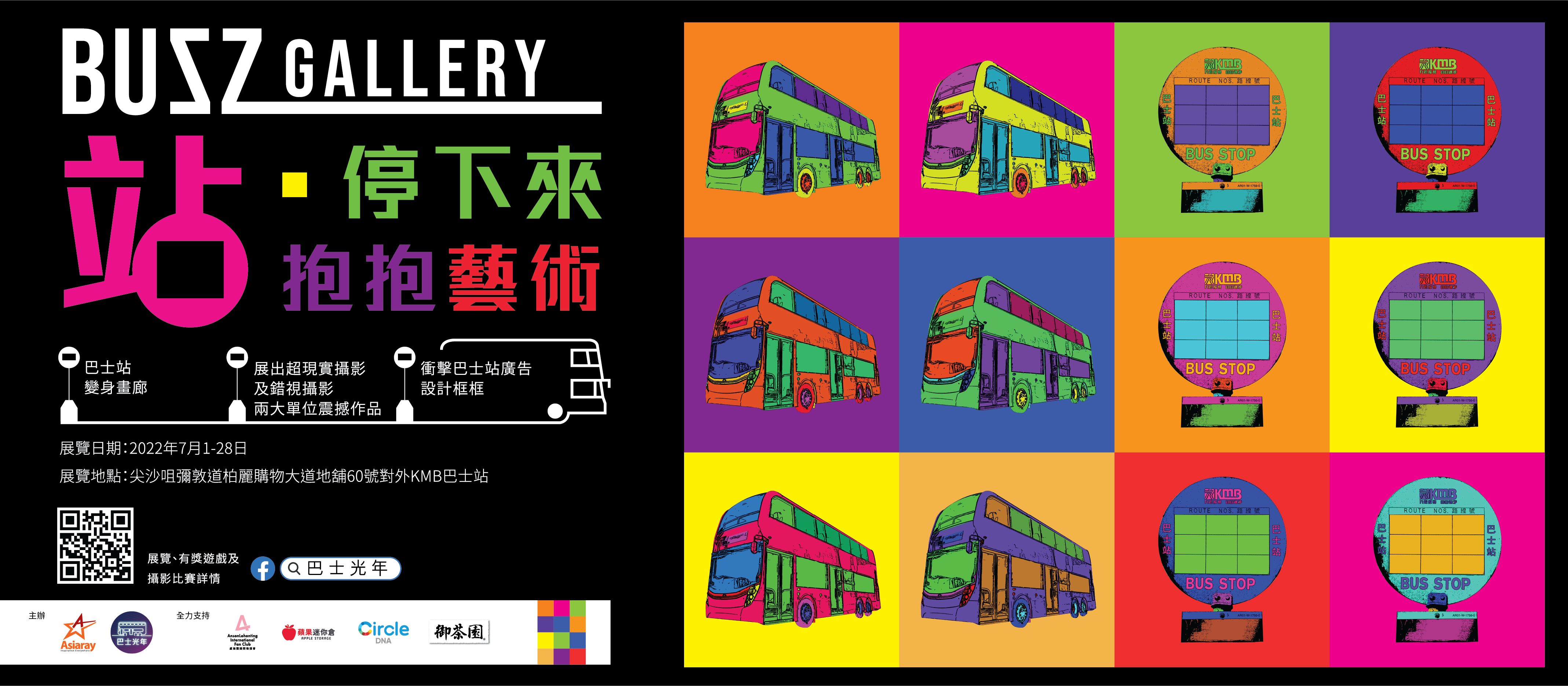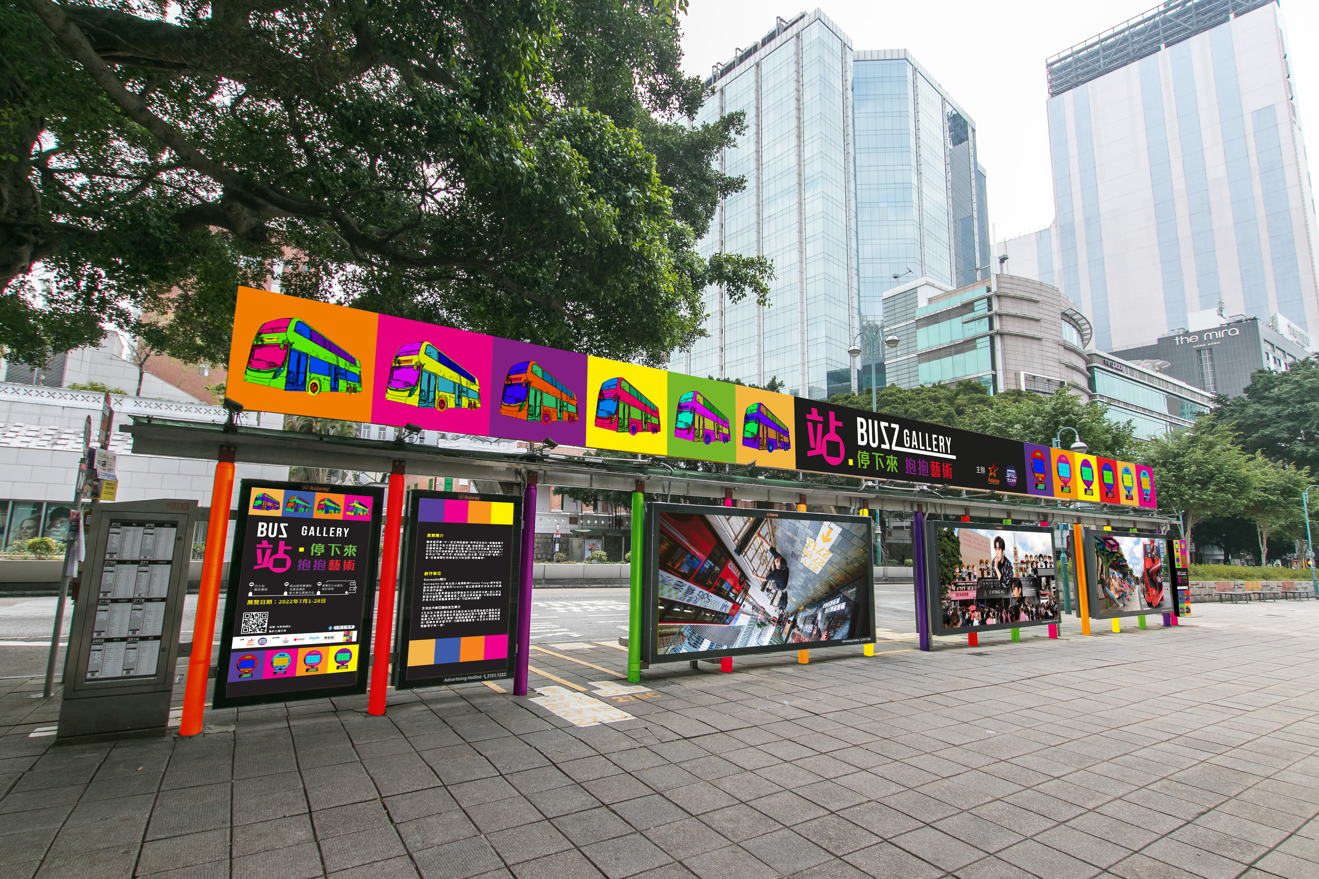 Asiaray及巴士光年將於7月1日至28日,於尖沙咀彌敦道柏麗購物大道地舖60號對外的九巴巴士站,突破傳統設立首個「Busz Gallery城市畫廊」,並且以「站・停下來 抱抱藝術」為主題,希望大家「暫停」一會,在這個繁忙的都會巴士站空間,擁抱藝術。