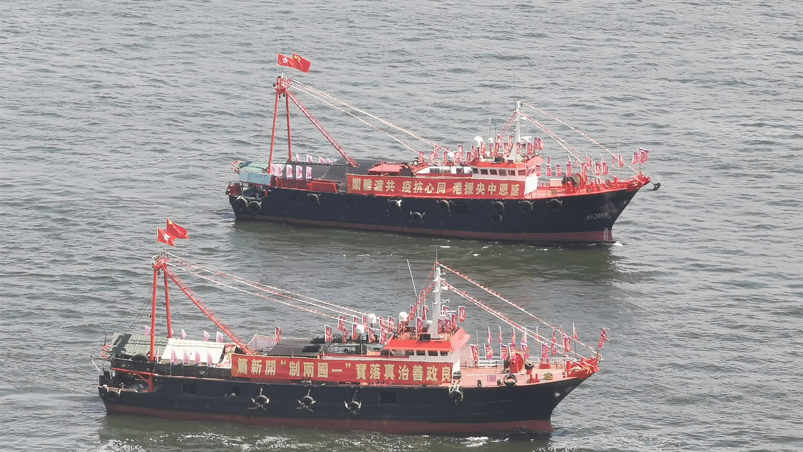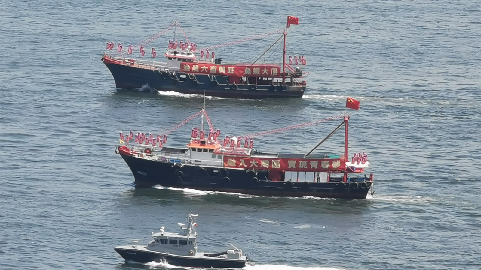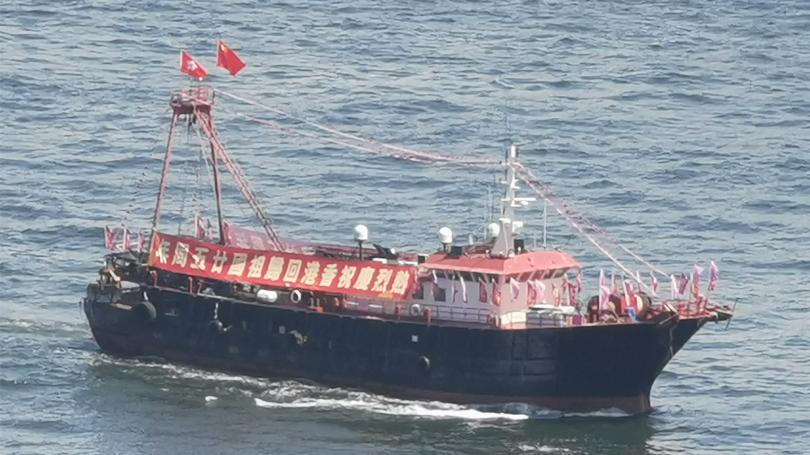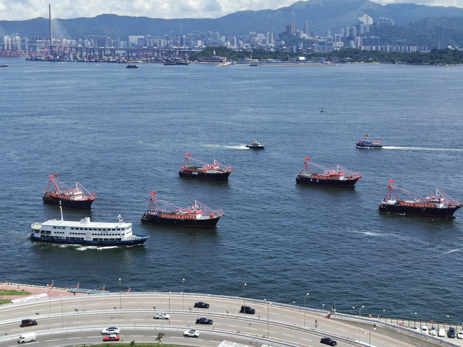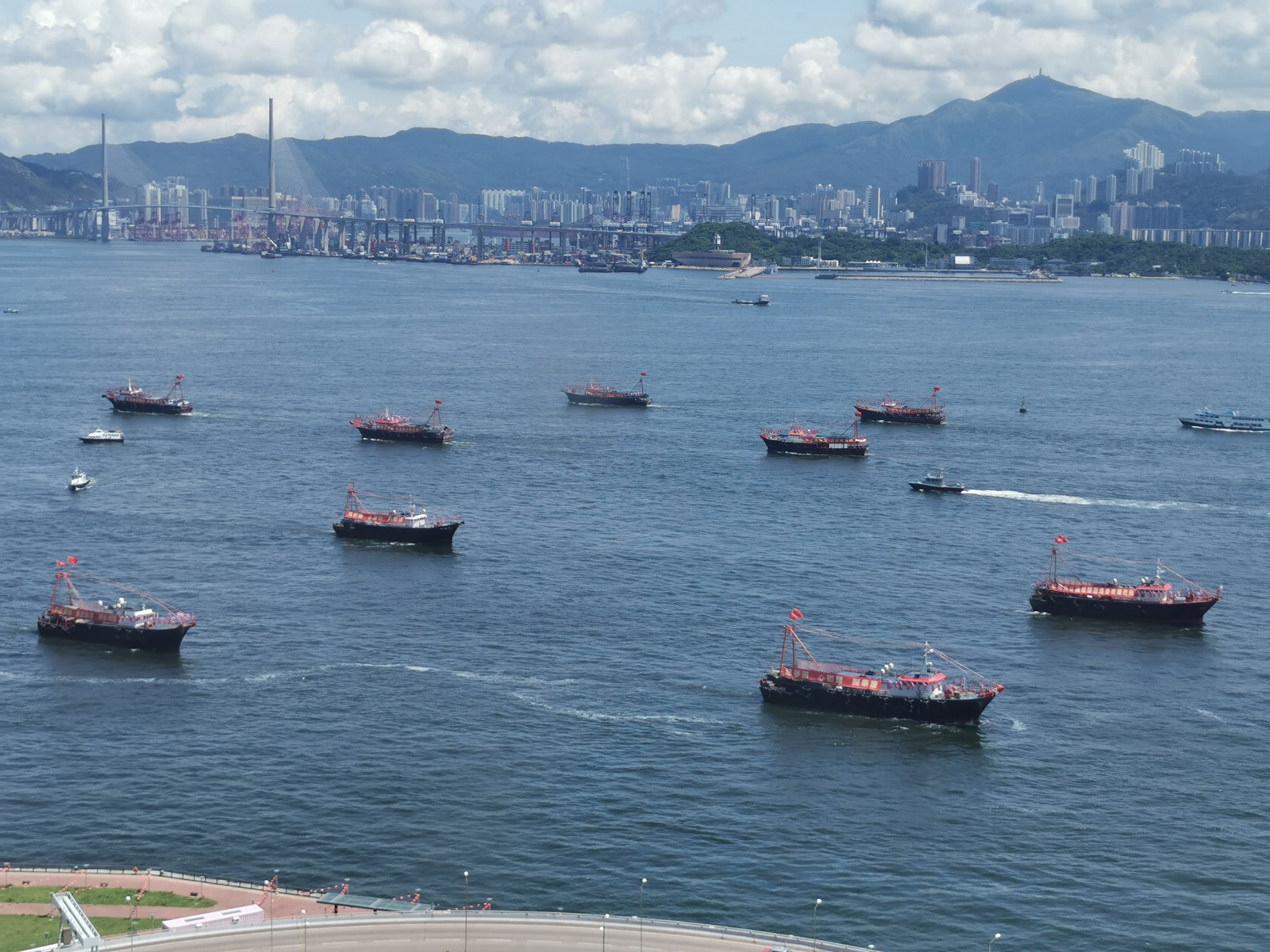 香港漁民團體聯會組織25艘大型漁船今早在維港巡遊,慶祝香港回歸25周年。圖:橙新聞