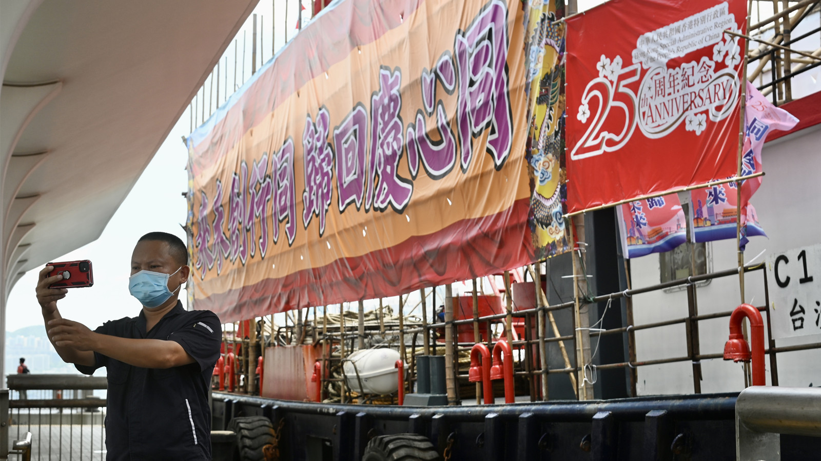 巡遊結束後,三艘領航船「慶祝號」和「感恩號」停在中環碼頭,「奮進號」則停在尖沙咀碼頭,供市民拍照打卡。