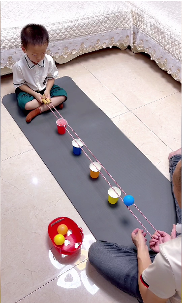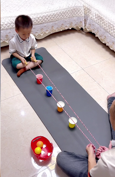 近日有一條影片於內地網上流傳並獲得過萬好評,影片中,一位爸爸和4歲的小朋友利用不同顏色的海洋球、塑料杯和繩子玩起「運輸海洋球」遊戲。遊戲開始時,爸爸一手扯住繩子,另一手將海洋球放上「運輸帶」,另一端的小朋友雙手握住跳繩的把柄控制「運輸帶」開合,等小球到達相同顏色的塑料杯子上方,及時移動手柄,讓小球落入杯中。小朋友玩得不亦樂乎,闖關時非常專注,闖關成功後臉上掛滿燦爛的笑容。有家長評論指,這個小遊戲簡便又實用,既鍛煉專注力又培養反應力,還可以增進親子感情。