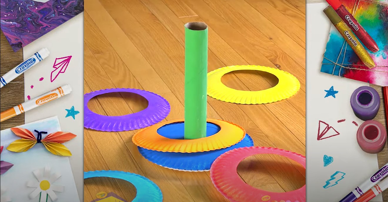 相信不少人小時候都玩過套圈圈的遊戲,投中目標物的滿足感和驚喜感是這個遊戲樂趣的來源。這個遊戲可以鍛煉孩子的手眼協調能力,還可以提升他們對於顏色及數字的認知。家長可以利用日常生活中常見的材料,例如紙盤,保鮮膜、廚房用紙紙筒製作一個簡易版的套圈遊戲:將廚房用紙的紙筒固定在一只紙盤上,然後把其他紙盤盤面剪出一個洞,讓孩子將紙筒和紙盤塗上喜歡的顏色,就可以開始遊戲!