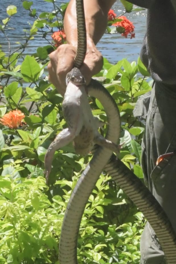 不過,水律蛇被擒後,即將青蛙美點吐出。檢回一命的大命青蛙,事後由清潔工放回水池。蛇王業指,兩條水律蛇長約5至6呎,並無毒性。