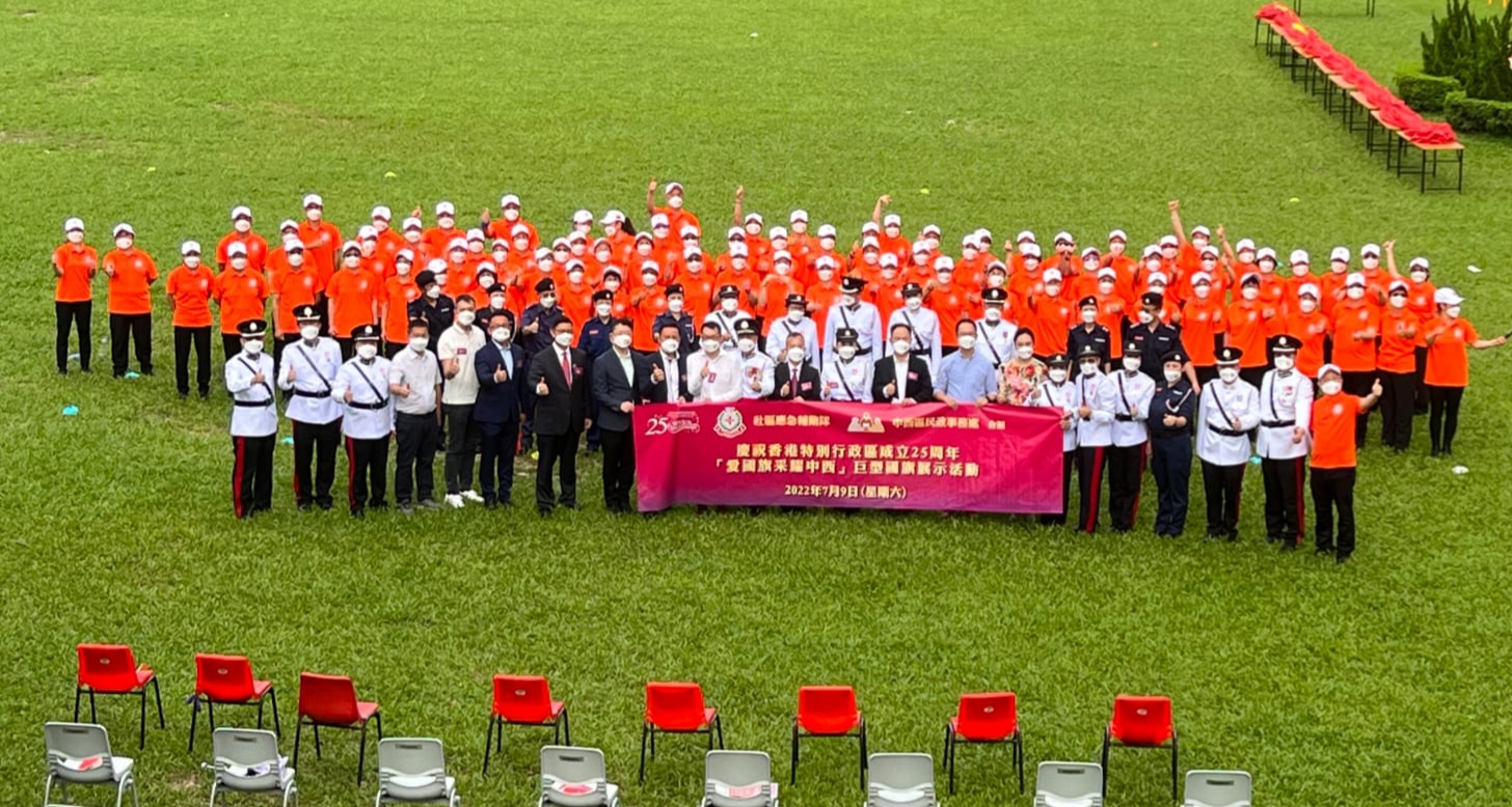 【橙訊】社區應急輔助隊與中西區民政事務署於7月9日合辦慶祝香港特別行政區成立25周年「愛國旗采耀中西」的巨型國旗展示活動。