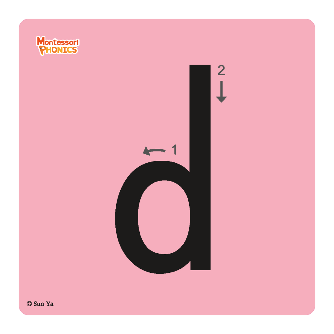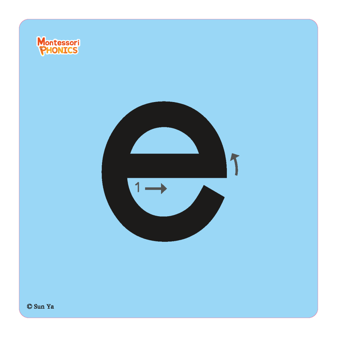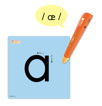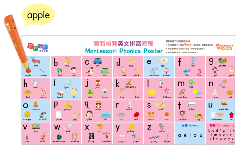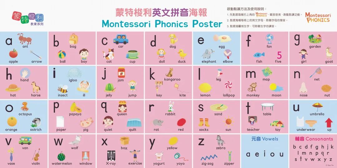 以小寫學習英文字母的發音,砂紙板底色分為藍色和粉紅色,分別代表元音(vowel)和輔音(consonant),讓幼兒能透過視覺辨識。