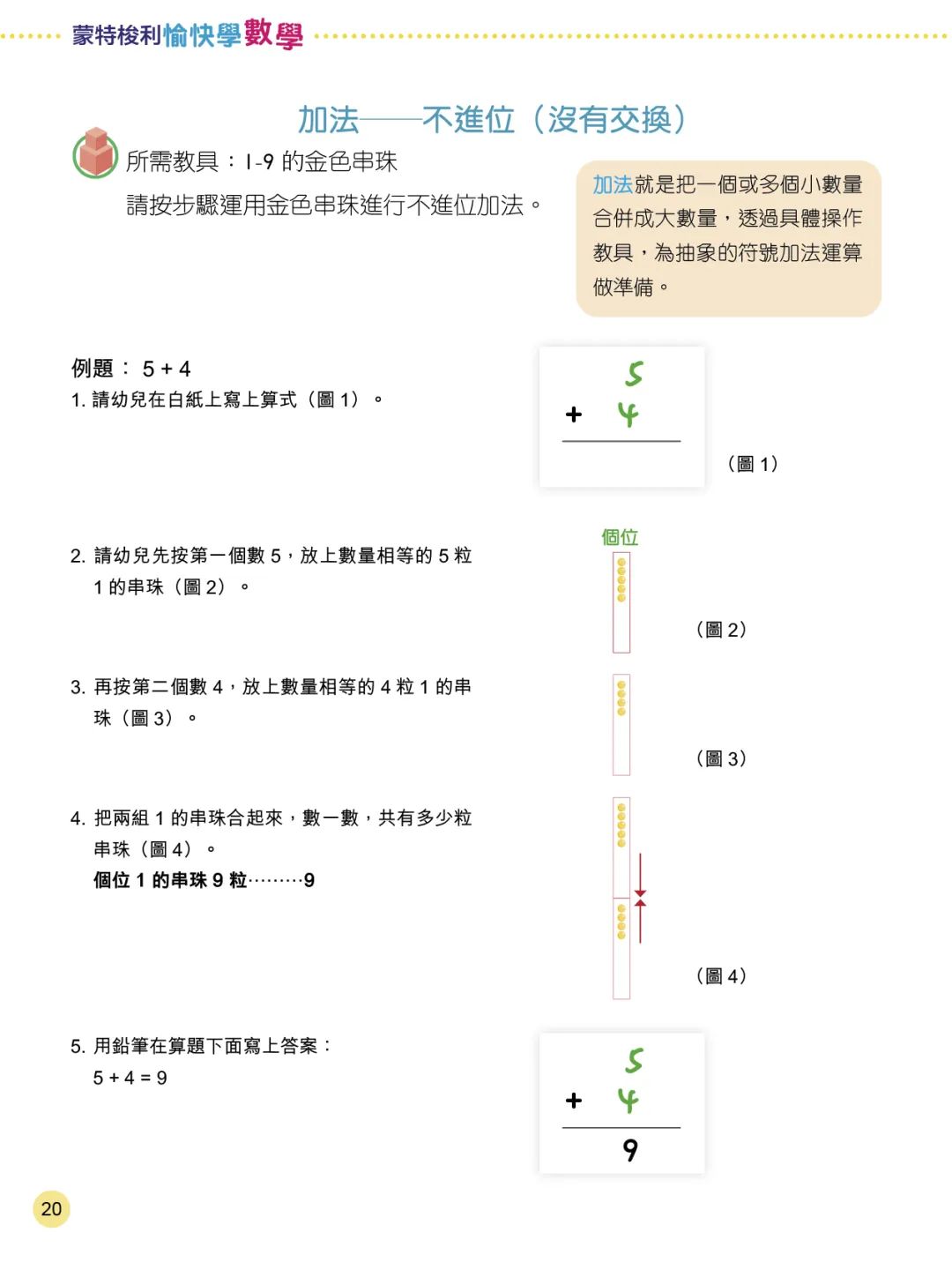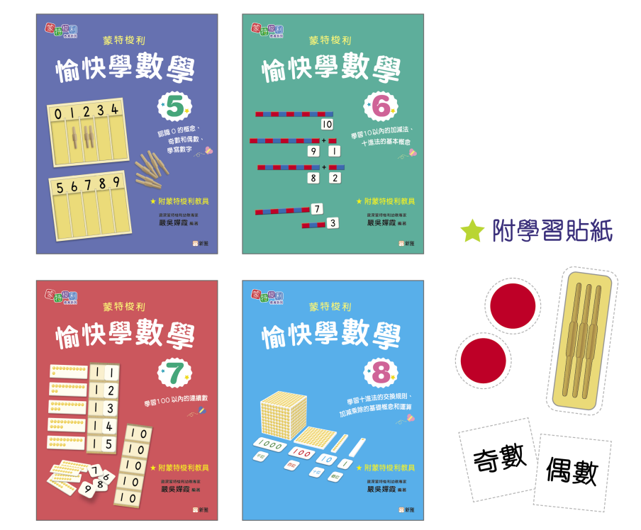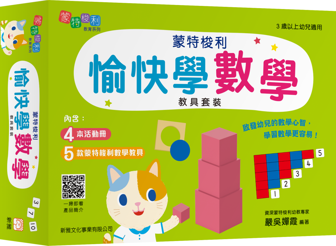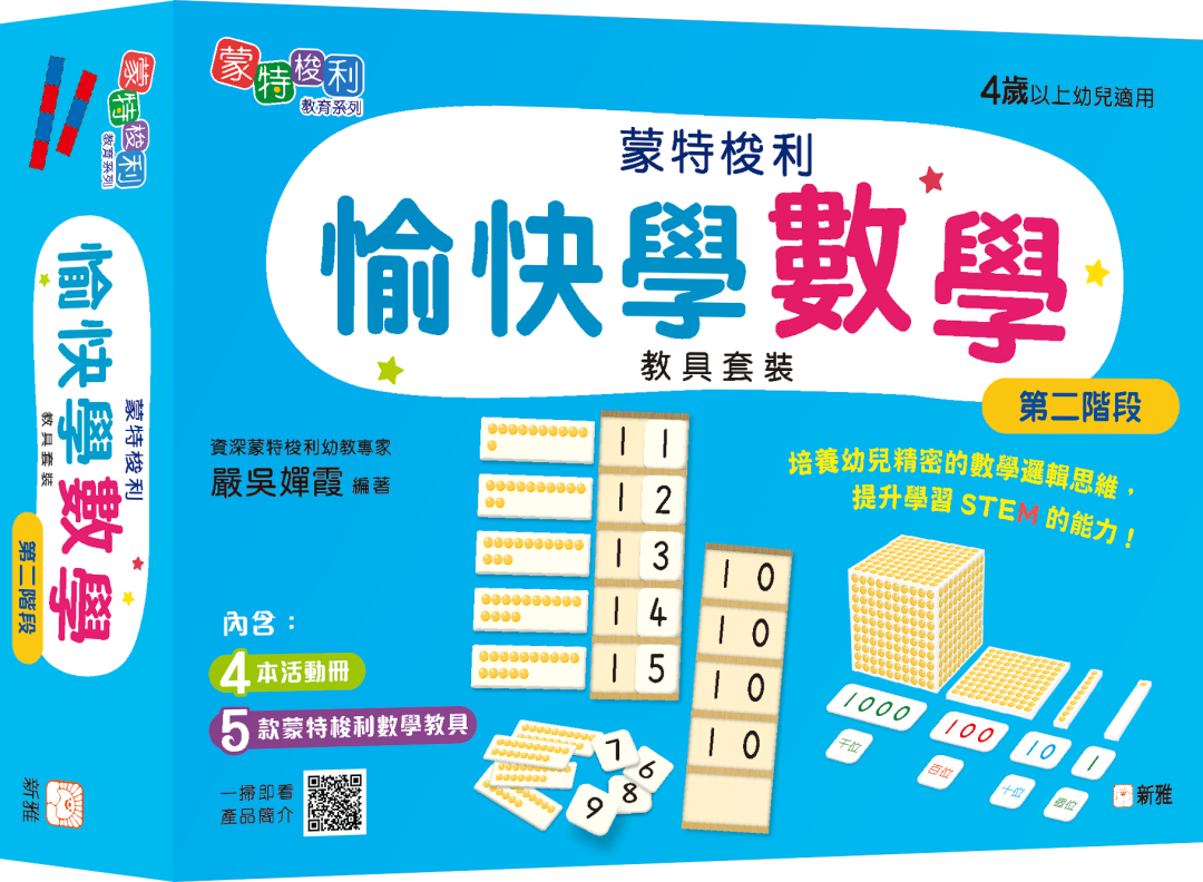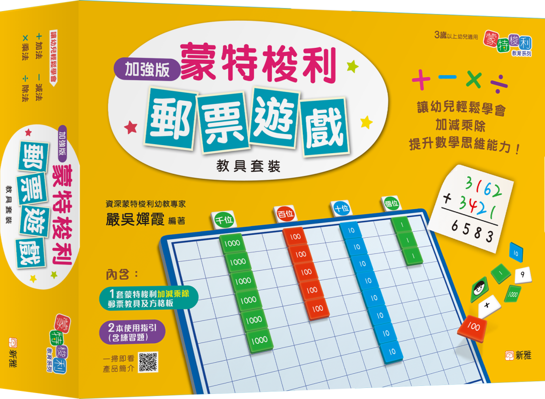 本系列尚有《蒙特梭利愉快學數學教具套裝》(第一階段)和《蒙特梭利郵票遊戲教具套裝》,孩子能有系統地從理解數前概念開始,進而加強十進法和加減乘除的運算能力!