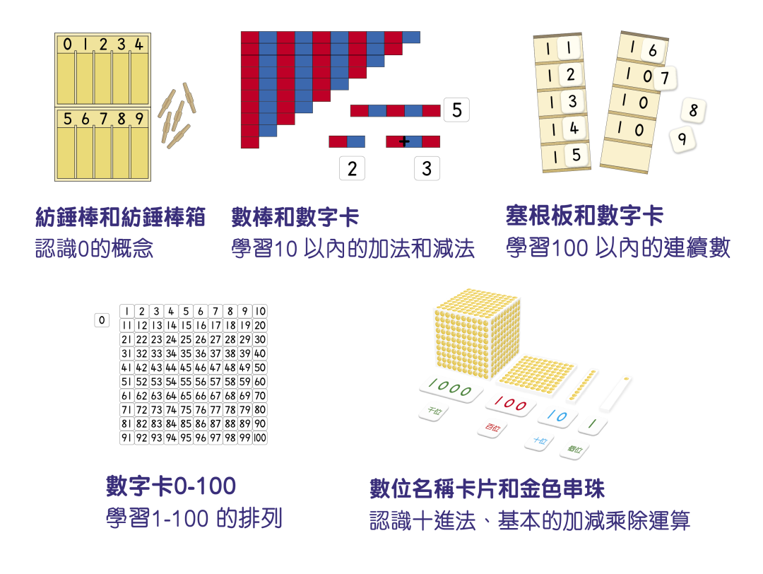 運用1000、100、10和1的金色串珠和數字卡,可以認識個、十、百和千位,還有量的概念,以及進行基本的加減乘除運算。
