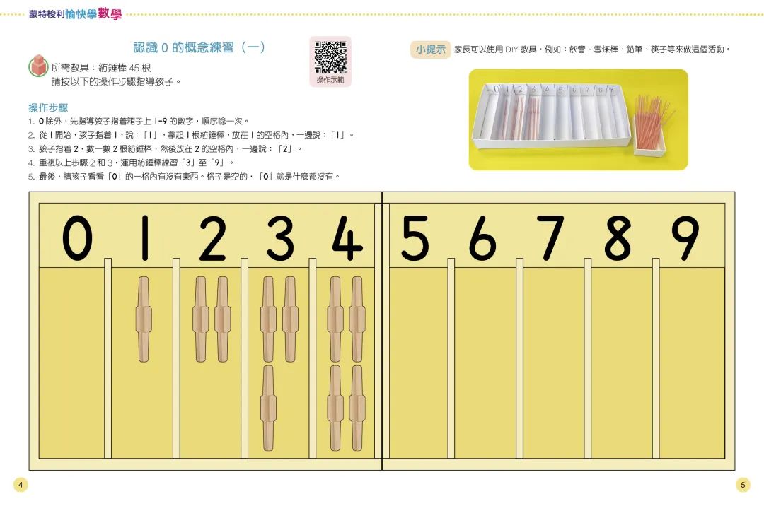 4本趣味活動冊,能配合教具使用,讓幼兒一邊操作一邊學習不同的數學概念。例如:按數量把紡錘棒教具放進不同的格子裏,看看哪個格子沒有紡錘棒,那就是「0」了!