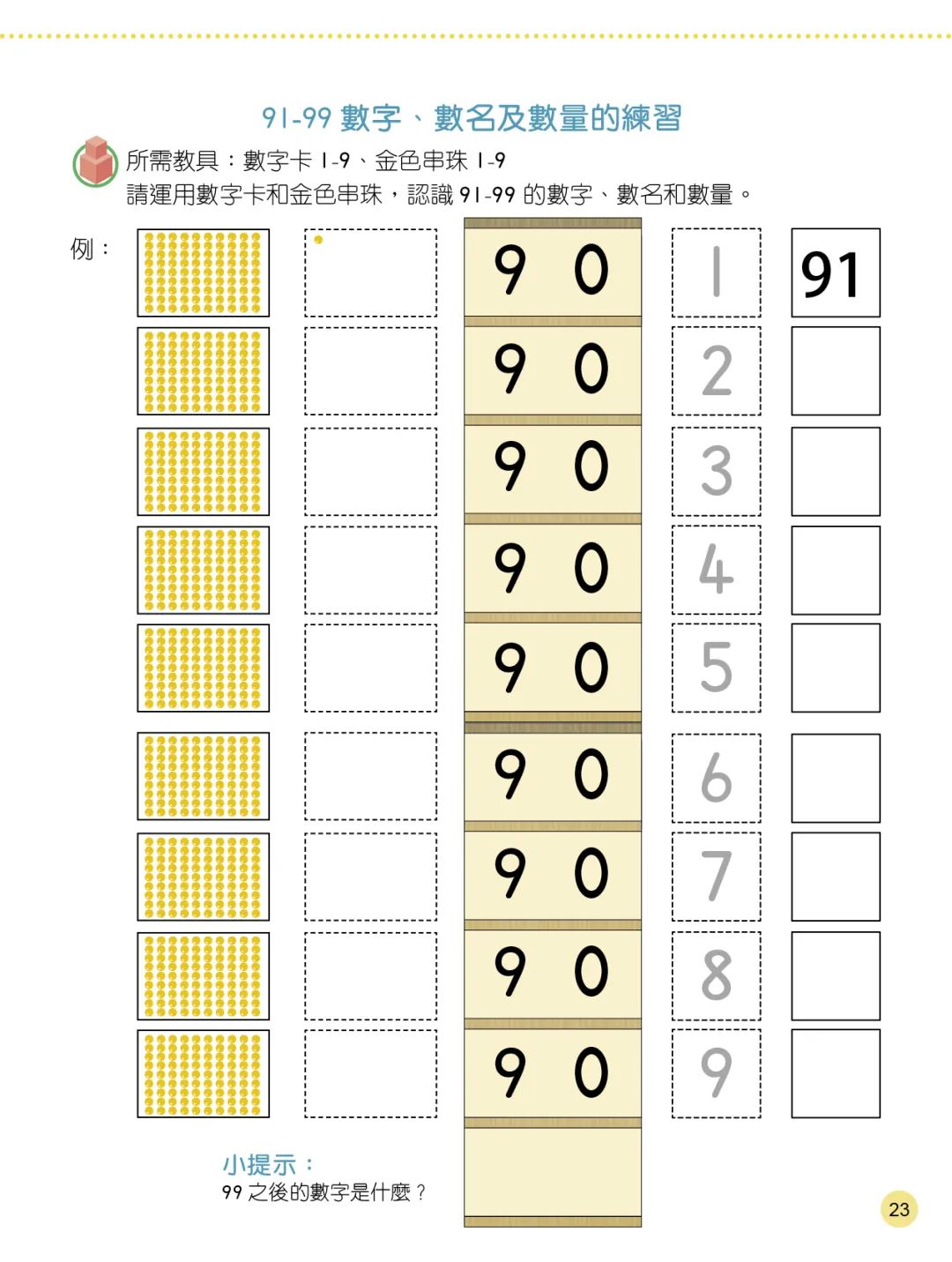 把數字卡和金色串珠放在塞根板上,幼兒可以學習11-99的連續數。