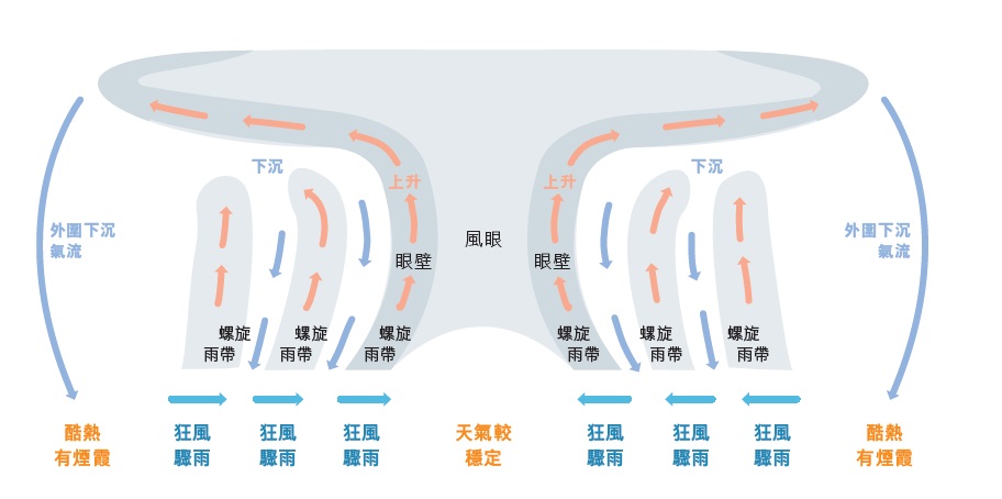 上圖顯示熱帶氣旋的大致結構:首先,我們看看熱帶氣旋的中心,一些較強的熱帶氣旋在其中心可能出現風眼,這裡的風勢較微弱,反而在中心周圍有猛烈的上升氣流,上升氣流處於雨帶的位置,雨帶經過的地方天氣惡劣,通常會有狂風暴雨。當上升氣流到達對流層頂時,由於更高層大氣(即平流層)一般處於穩定狀態,氣流不能再上升,隨之會往水平方向由中心往外擴散,最終在熱帶氣旋較外圍位置形成下沉氣流。