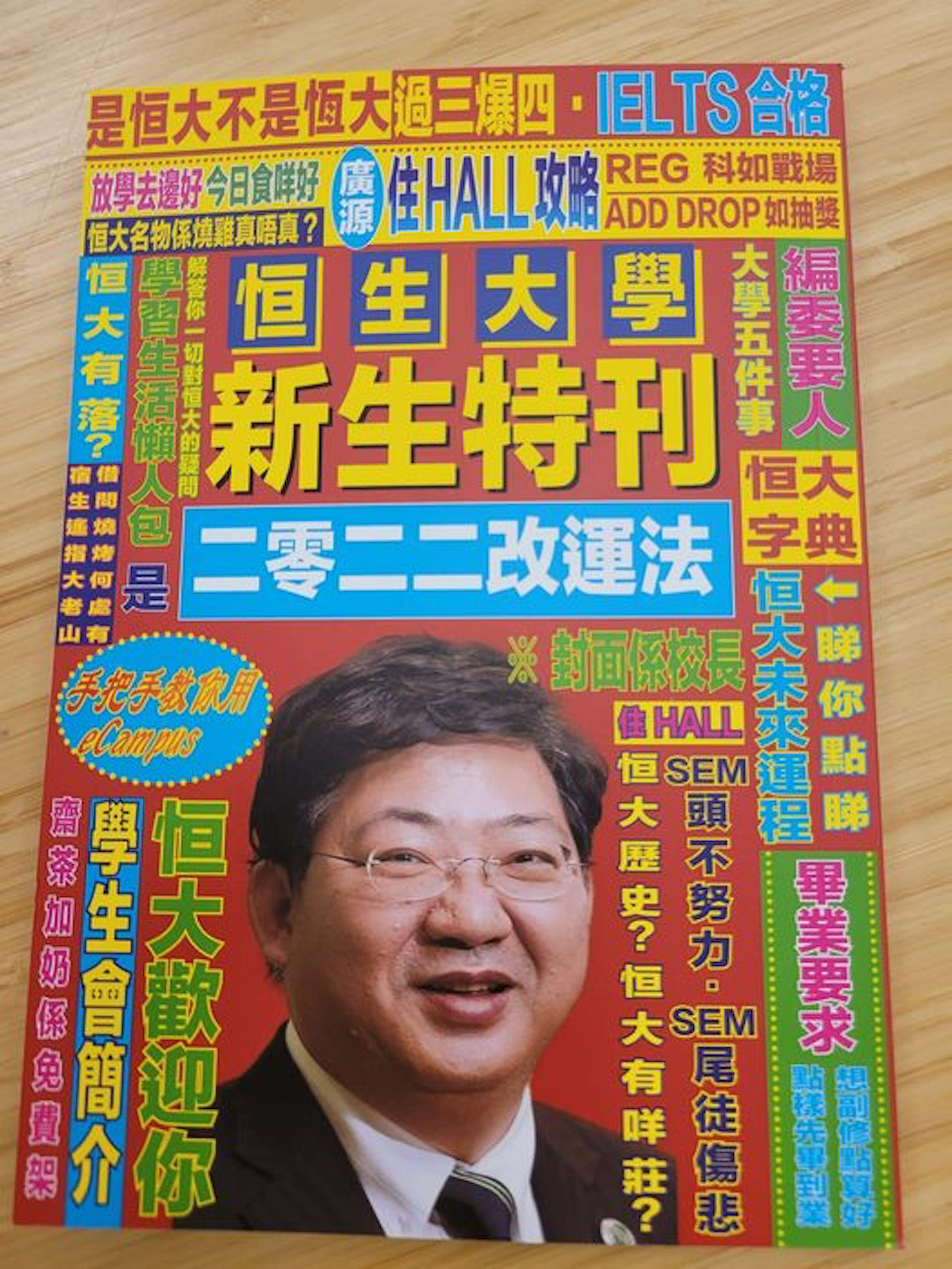 近日香港恒生大學編委會推出新書,以紅及黃色作主調,配上運程書式字體及排版,中間還有校長何順文大頭照,乍眼一看誤以為是風水師李居明出版的運程書。不過,那本原來是新生特刊,今次將沉悶的校園簡介改頭換面,大玩惡趣味,將新生須知羅列在封面,例如「二零二二改運法」、「是恒大不是恆大」、「過三爆四」、「IELTS合格」、「大學五件事」、「學生會簡介」、「大學五件事」、「畢業要求」等,一眼看清書中內容大綱。