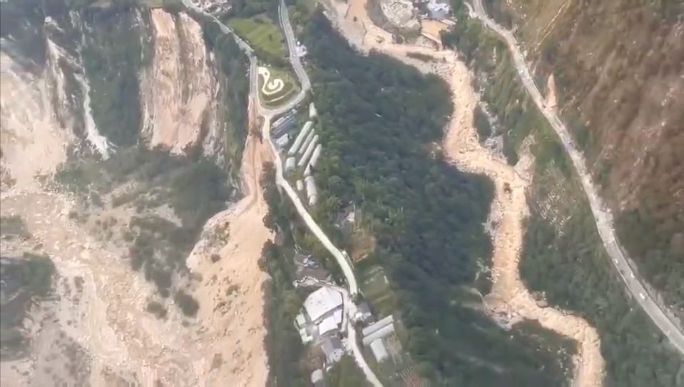 瀘定地震導致大量的山泥傾瀉,圖為成都市消防救援支隊航拍影片截圖。