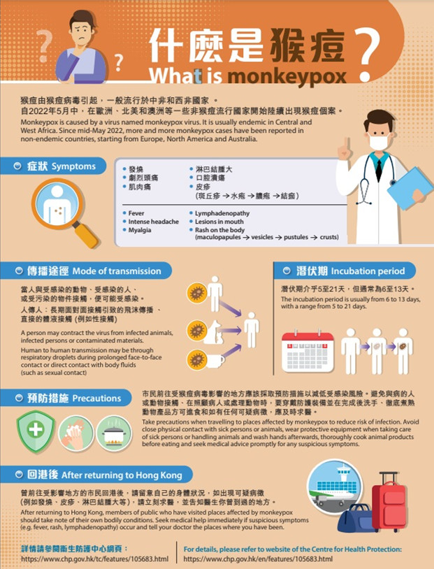 衞生防護中心已加強猴痘的實驗室監測工作。私家醫生可為臨床診斷吻合但未符合呈報懷疑個案要求的人士收集拭子樣本,送交中心的公共衞生化驗服務處進行免費猴痘檢測。中心已於早前發信通知全港的醫生和私家醫院上述資訊,並提醒他們留意參考海外經驗得知感染猴痘的非典型症狀(包括生殖器官及口腔的不明潰瘍)。
